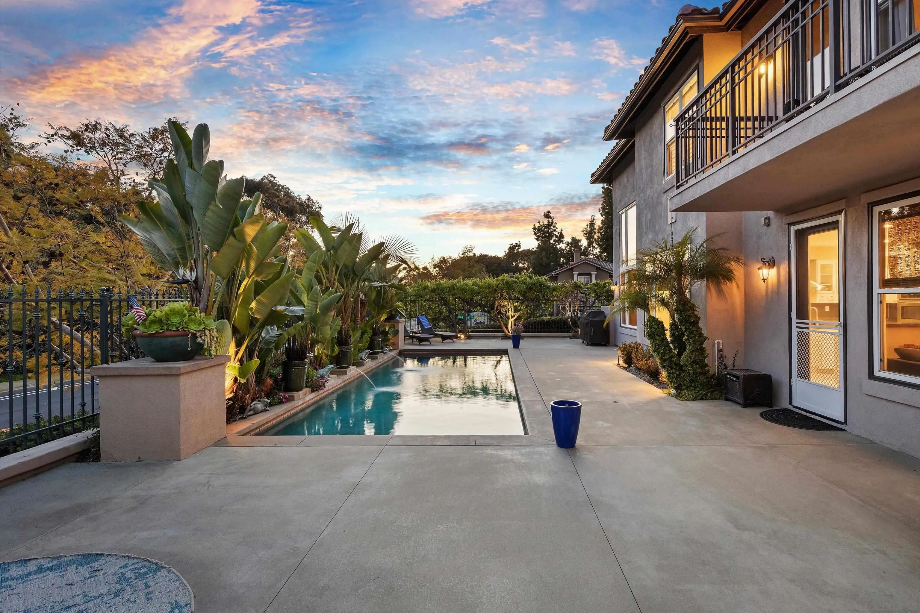 Set on a corner lot in Cantata at Aviara, 1405 Cressa Court is a former model home and the largest floor plan in a community where listings rarely become available. The home opens to formal living and dining rooms with 18-foot ceilings, oversized windows, and a limestone fireplace. Designer finishes are showcased throughout, with three fireplaces—in the living room, family room, and primary suite. The island kitchen is built for living and entertaining: a professional Bertazzoni gas cooktop, double ovens, built-in wine fridge, and quartz counters opening to the breakfast area and family room. A downstairs bedroom with full bath works as a guest suite or home office. Upstairs, the primary suite offers a fireplace, private balcony, spa bath, and treetop views. Three additional bedrooms, laundry, and an attached three-car garage with EV charger complete the layout. The backyard feels like a private escape—a pool, newly refinished deck, mature tropical landscaping, and multiple seating areas. Major upgrades include a new roof and owned solar (NEM1). The location defines the lifestyle: walking distance to Batiquitos Lagoon trails, minutes to Aviara Golf Club and Park Hyatt Aviara Resort, and a short drive to Carlsbad beaches. Top-rated Aviara Oaks Elementary and Middle are nearby. HOA dues cover common area landscaping, miles of walking trails, and perimeter fencing along Batiquitos.