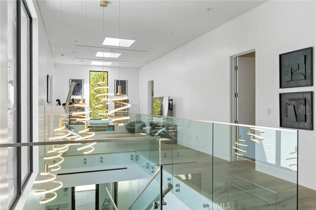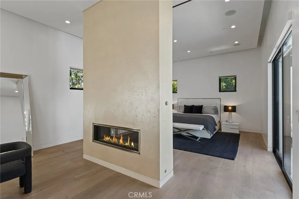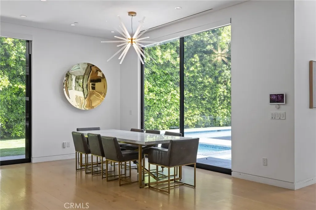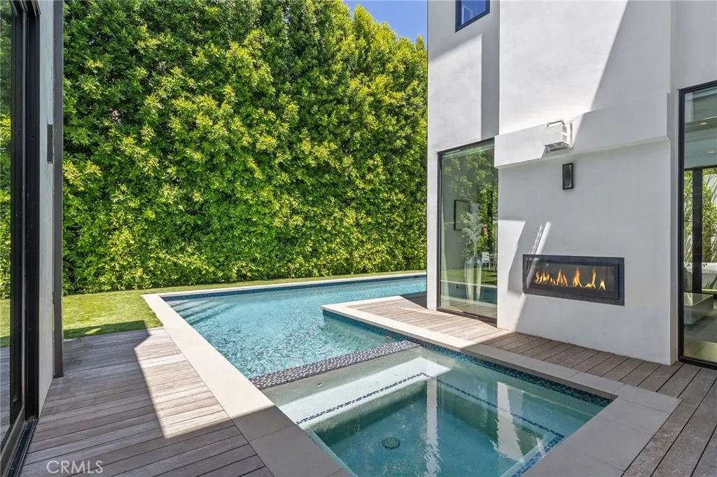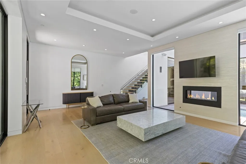 Gated and set behind a long private driveway, this custom contemporary estate offers exceptional privacy and refined modern living on one of the most desirable streets south of Ventura Boulevard. Surrounded by mature bamboo and ficus trees, the home provides a serene, resort-like setting just moments from Sherman Oaks best shopping and dining. Soaring ceilings and walls of glass fill the interiors with natural light, seamlessly connecting the open-concept living, dining, and chefs kitchen. The kitchen features premium Bosch and Viking appliances, custom cabinetry, a walk-in pantry, and a striking Calacatta marble island, complemented by a sleek glass-enclosed wine display and double-sided fireplace. Expansive sliding doors open to an entertainers backyard with a dramatic negative-edge pool, spa, and built-in BBQ, ideal for indoor-outdoor living. The main level includes a private bedroom suite perfect for guests or an office. Upstairs offers a family lounge, four en-suite bedrooms with walk-in closets, a spacious primary suite with fireplace and spa-style bath, and an upstairs laundry room. Built in 2018 with parking for 10+ cars, and just a short walk to Whole Foods, restaurants, the Sherman Oaks Galleria, and minutes to Buckley and Campbell Hall.