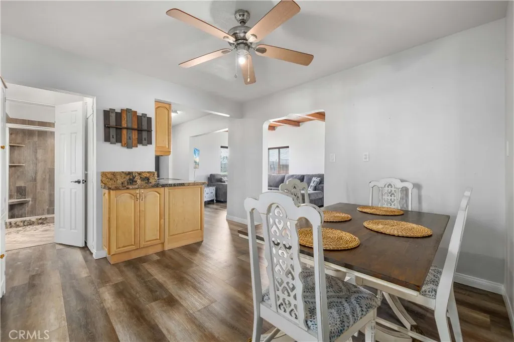 Country living at its Best on 1.24 Acres! Could easily be 3 Bedrooms. This charming and inviting home offers warmth, character, and a long list of valuable upgrades. Step into a spacious living room with beautiful wood beam ceilings and abundant windows that fill the home with natural light. A Blaze King wood-burning stove adds cozy ambiance and efficient heat for those cooler evenings. The updated kitchen features upgraded stainless steel appliances and flows easily into the heart of the home. You'll also love the huge combination laundry room and walk-in pantry, offering exceptional storage and functionality. Need extra space? The 13' x 20' enclosed patio includes its own mini-split system, making it perfect as a family room, guest space, office, or potential third bedroom. The home also features evaporative cooling to help keep energy costs down. Outside, the property truly shines with a rare oversized 4+ car garage/workshop ideal for hobbyists, mechanics, storage, or small business needs. A large concrete slab in front of the garage provides additional parking or workspace, and a concrete walkway connects the garage to the home for convenience. Recent improvements include: Brand new flooring throughout most of the home + new bedroom carpet + Fresh interior paint + New baseboards throughout + All new plumbing and water lines + Fully landscaped front yard with sprinkler/irrigation system + Newer front fence and sliding entry gate This adorable property offers space, comfort, and versatility all while qualifying for USDA 100% financing. A rare opportunity to enjoy peacef