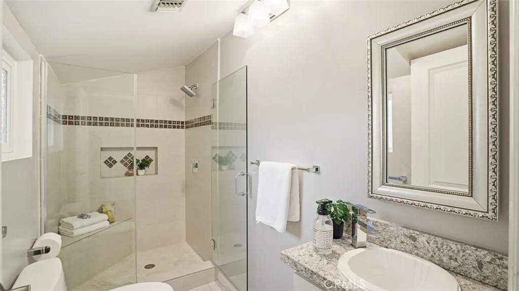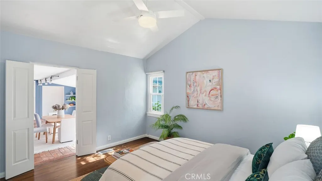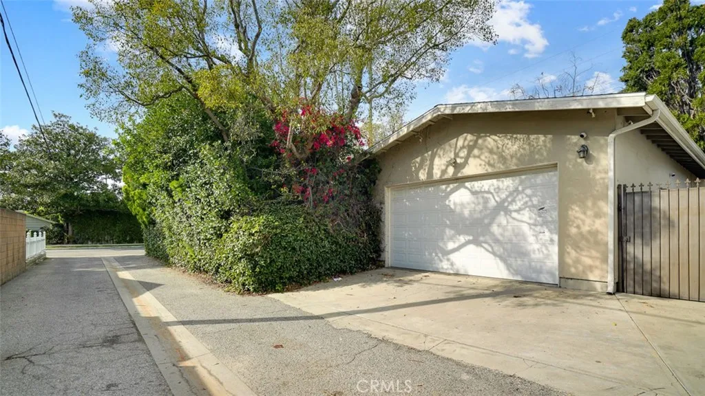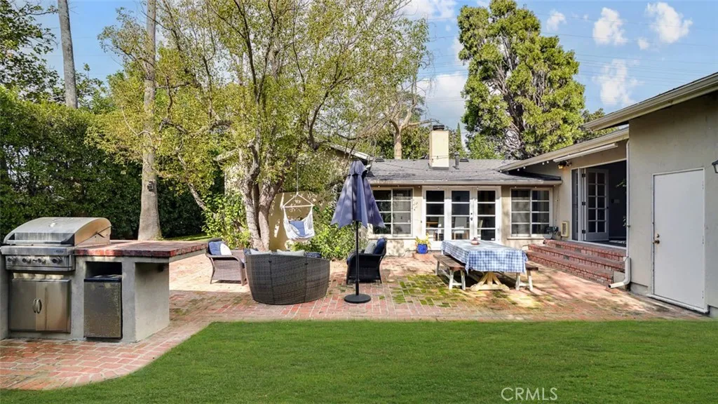Tucked behind tall privacy hedges on a prime corner lot, this beautifully updated 3-bedroom + office, 3-bath ranch-style home offers effortless indoor-outdoor living in the heart of Sherman Oaks. Bathed in natural light, the thoughtfully designed floor plan blends classic charm with modern updates. A vaulted living room with beamed ceiling anchors the home, flowing seamlessly into a dining room that opens directly to the expansive backyard. The updated kitchen features Caesarstone countertops, stainless steel appliances, recessed lighting, and clean, timeless finishes. The spacious primary suite is a true retreat, complete with dual walk-in closets, French doors going out to the backyard, and a spa-inspired bath complete with soaking tub. Two generous secondary bedrooms and updated baths are thoughtfully positioned in a separate wing, while a detached office provides an ideal work-from-home setup or creative studio. Step outside to your own private oasis: a heated, covered saltwater pool and spa, built-in BBQ area, mature landscaping, and glowing bistro lights create the ultimate setting for entertaining or unwinding under the stars. Alley access to the two-car garage ensures both convenience and discretion. Recent upgrades include a new roof, Nest thermostat, Google Nest cameras, DoorBird video doorbell, and ADT security system. Refined, private, and move-in ready welcome home!
