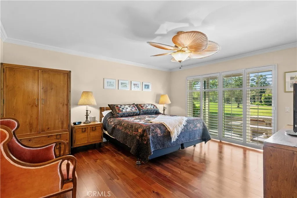 Beautifully remodeled home on a private cul-de-sac, offering panoramic views of the golf course, pond, city skyline, and sunsets, perfectly situated near the 6th and 7th fairways. Through the front gate is a courtyard featuring a fountain and rock waterfall. Inside the front door is an open room, illuminated by a skylight, that flows into the main living spaces, making it ideal for a playroom or guest area. This home has an open floor plan with cathedral ceilings and recessed lighting, enhanced by dual-pane windows that fill the space with natural light. Beautiful hardwood flooring throughout (with tile flooring in kitchen, bathrooms and laundry area). The living room seamlessly connects to the dining area and the gourmet kitchen, complete with Quartzite countertops and custom cabinetry. Sliding glass doors from both the dining room and kitchen lead to separate outdoor decks, perfect for relaxing amid lush greenery. The primary bedroom features a sliding glass door that opens to a back patio with amazing golf course views. It also includes a spacious ensuite bathroom with two vanity areas, each with its own sink and cabinets, a walk-in shower, and a privacy door to the toilet. The second back bedroom offers wide-open golf views and can easily serve as an office. Each bedroom is thoughtfully equipped with a ceiling fan for added comfort. Enjoy the convenience of a finished storage area, accessed through the downstairs front bedroom walk-in closet. The kitchen, main floor bathroom, and primary bathroom were all beautifully remodeled four years ago, while dual-pane windows wer