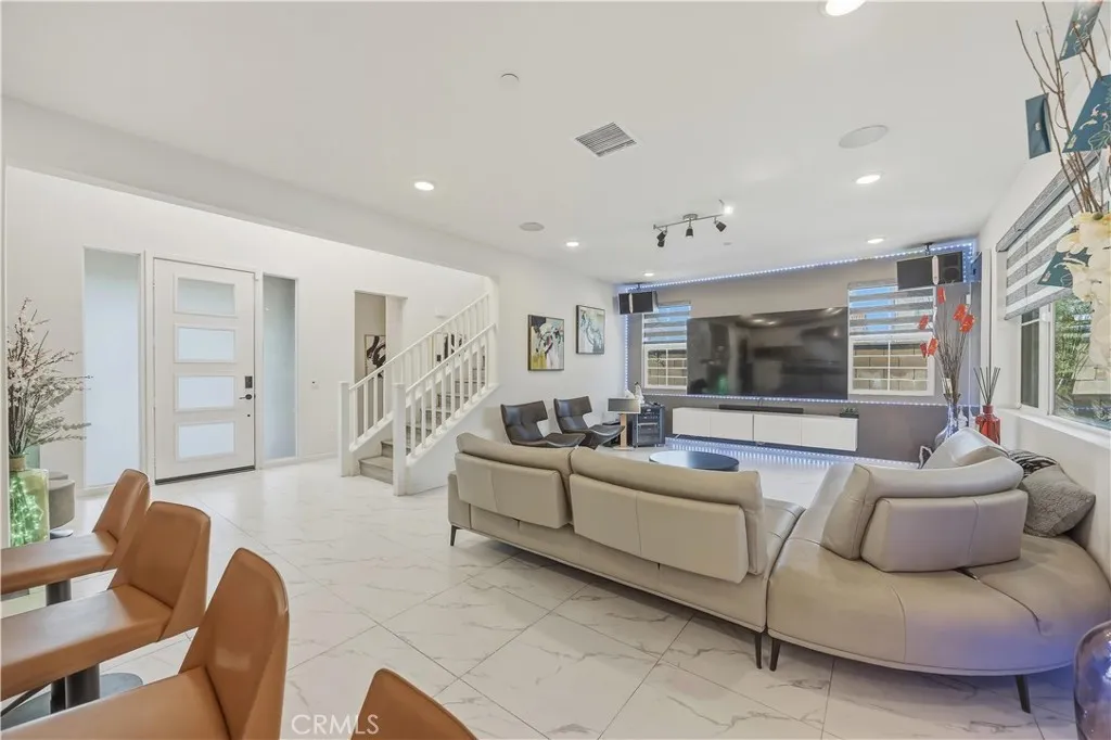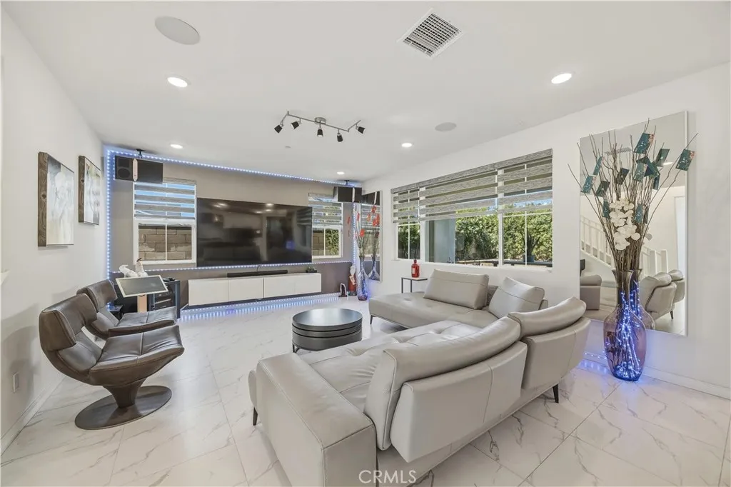 Experience elevated living in one of the most highly upgraded luxury residences available in Ontario Ranch. Offered at $1,180,000, this exceptional north-facing, south-oriented home combines sophisticated design, modern comfort, and premium entertainment features rarely found in todays market. Designed with both everyday living and entertaining in mind, the spacious floor plan features 5 bedrooms and 5 bathrooms, providing flexibility for multi-generational living, guest accommodations, or private office space. Extensive designer upgrades throughout the home showcase true pride of ownership. Interior highlights include a whole-home sound system, dedicated karaoke entertainment setup, motorized window shades, custom ambient lighting, and stunning crystal chandeliers that create an elegant and inviting atmosphere. The home is meticulously maintained and presents in excellent turnkey condition. Professionally designed front and backyard landscaping offer beautifully curated outdoor living spaces ideal for relaxation or hosting gatherings. The expansive three-car garage provides ample parking and storage. Additional upgrades include a rooftop solar energy system designed to enhance energy efficiency while reducing long-term utility costs. A rare opportunity to own a fully upgraded entertainers home combining luxury, comfort, and functionality in a highly desirable community.