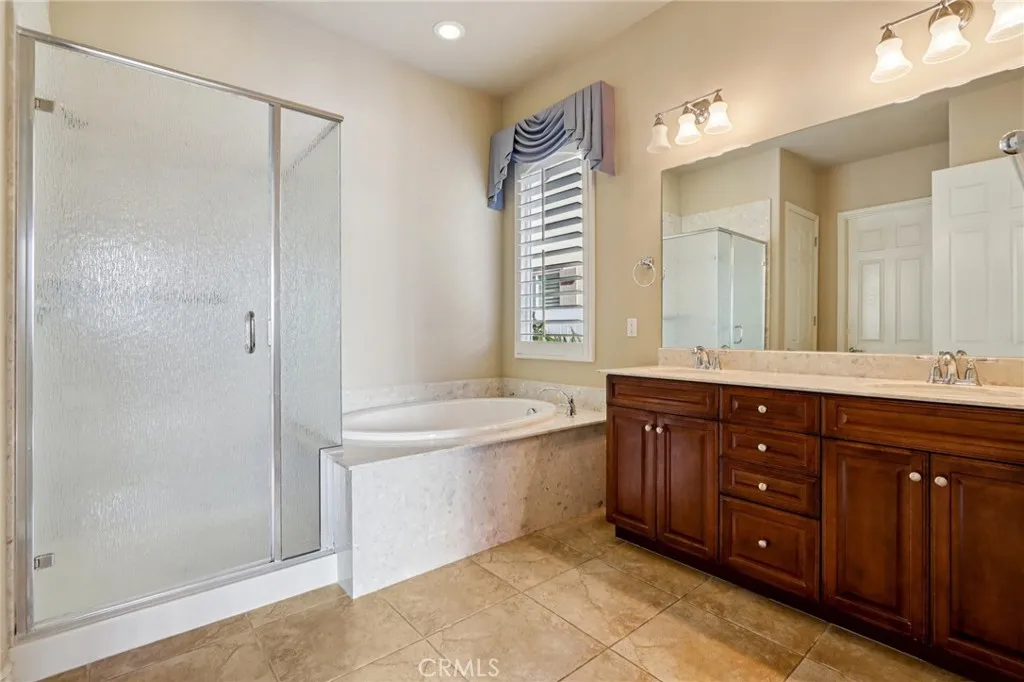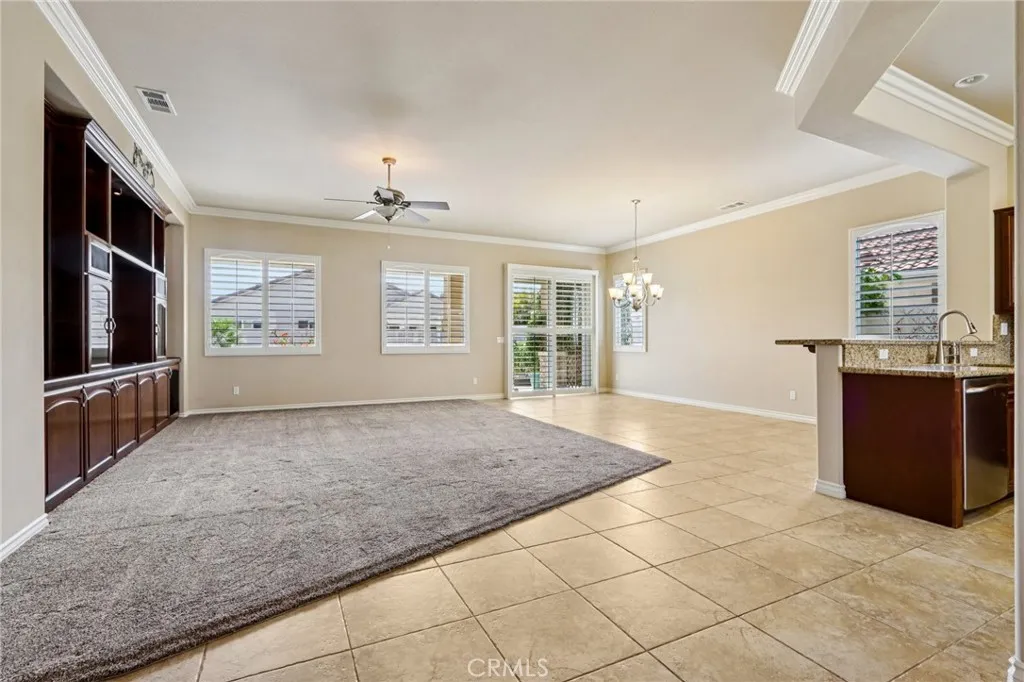 Welcome to Resort-Style Living in the 55+ Community of Solera Diamond Valley by Del Webb! This beautifully upgraded 55+ residence combines thoughtful design with comfort and convenience, offering a one-of-a-kind opportunity in Hemets premier active adult community. From the moment you arrive, youll notice the care and attention poured into every detail. Step inside to find elegant crown molding, plantation shutters, and custom cabinetry throughout the living room, office, craft room, laundry, and master bath. The tiled living room floor with carpet overlay gives you the flexibility of enjoying both tile and carpet. The kitchen is a true chefs delight, featuring under-cabinet lighting, and a water filtration system. The air-conditioned garage offers exceptional functionality with a built-in workbench, storage racks, and generous space for a second refrigerator and freezer. Outside, youll love the xeriscape front yard with river rock, rain gutters, and a welcoming front gate and patio. The backyard is a private retreat, complete with a little fish hole, flagstone paving, bullnose edging, and drip irrigation for effortless maintenance. A dog door adds convenience for pet lovers, while the outdoor storage shed provides extra space for tools and hobbies. Comfort and peace of mind are built in with steel security screen doors, an all-house fan, and a comprehensive exterior surveillance system featuring eight cameras with night vision, motion detection, infrared augmentation, and a large monitor with two-week memory storage. In the master bathroom, youll appreciate the step-in sho