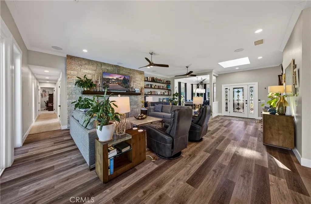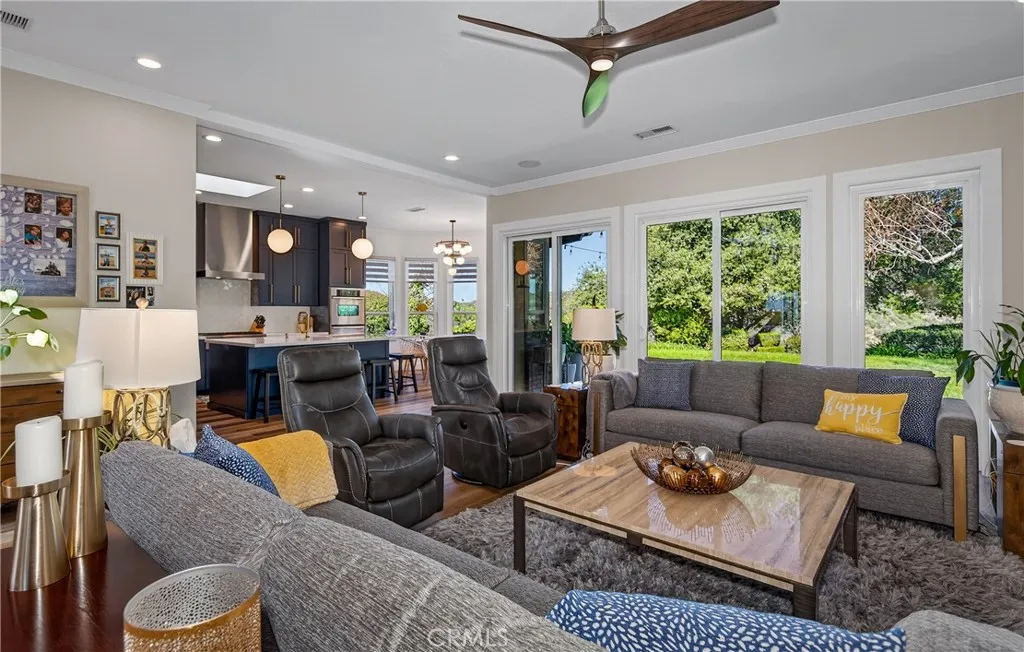 A RARE HILLSIDE RETREAT BACKING TO WILDWOOD CANYON where privacy, views, and design come together in a one-of-a-kind setting. This home offers unmatched privacy, breathtaking natural surroundings, and no rear neighbors. Enjoy daily encounters with nature, where deer, and native wildlife create a peaceful, ever-changing backdrop and experience. This upgraded home has undergone over $250,000 in improvements, blending modern comfort with custom upgrades. The inviting living room with expansive windows that frame breathtaking canyon views creates a stunning backdrop of natural beauty. Jaw dropping focal points are the floor to ceiling stone fireplace with thermostat control, and floating shelves with custom built-in storage with pull-out shelving. The updated kitchen was tastefully designed with blue cabinetry, iced with gold hardware, custom backsplash, and pull-out shelving. A stunning casual dining space wrapped in windows located in the kitchen, where every meal is accompanied by serene views, seamlessly bringing the beauty of the outdoors in. The circular formal dining room is a standout feature, surrounded by windows that capture the beauty of the outdoors from every angle with ample space for entertaining. Downstairs offers two guest bedrooms, and a full bathroom. As you enter the home from the garage, conveniently located is the indoor laundry room with ample storage, and an additional guest bath. Upstairs, the elevated loft style primary suite creates a semi-private retreat with unique touches including a pop-up TV hidden within custom cabinetry, city light views and a
