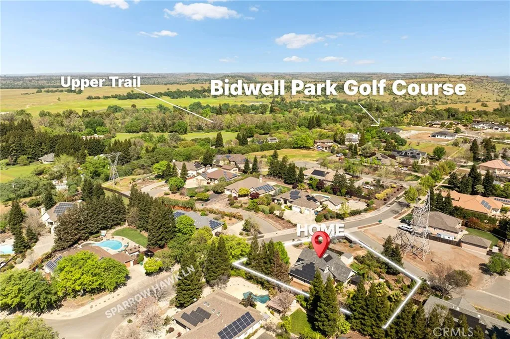 Set in a sought-after neighborhood near Upper Bidwell Park, this 4 bedroom, 2.5 bathroom home with owned solar offers a flexible layout and expansive outdoor space. This spacious 0.54-acre property offers a great outdoor setup with mature trees, roses, a garden area, and a large covered patio with extended flagstone walkwaysplus plenty of room to expand or customize. At the front of the home, French doors open to a flexible den or bonus space that works well as a home office, second living area, or potential 5th bedroom. Inside, the open layout is complemented by 10-foot ceilings, crown molding, and oversized baseboards, creating a comfortable and cohesive feel throughout. The main living and dining areas are anchored by a two-sided gas fireplace and offer nice views of the backyard. The kitchen is spacious and functional, featuring granite countertops, a tile backsplash, double ovens, an extra-large pantry, and a peninsula with bar seating that connects to the dining areaideal for everyday living and entertaining. The downstairs primary suite offers privacy and space, complete with a large walk-in closet and an en-suite bathroom with dual sinks, a jetted tub, separate shower, and privacy door. Also downstairs is a half bath and an indoor laundry room with a sink, counter space, and plenty of storage. Upstairs, youll find three generously sized bedrooms and a full bathroom. Additional features include whole-house sound wiring, a 3-zone HVAC system, a whole house fan, and owned solar for added efficiency. The backyard is expansive and thoughtfully laid out with mature landsc