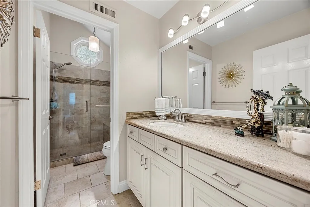 This beautifully updated Cape Codinspired home blends timeless charm with modern comfort, offering the ease of mostly single-story living with a highly sought-after downstairs primary suite. From the moment you step inside, sleek tile flooring guides you into a stunning living room with soaring ceilings and a dramatic wall of windows that flood the space with natural light while showcasing serene views of the backyard. A dry bar with a wine fridge is accessible from the living and formal dining room. The updated kitchen is both stylish and functional, featuring sleek granite countertops, stainless steel appliances, abundant cabinetry in warm wood tones, customized with convenient roll-outs and appliance garage, generous prep space, and a charming garden window. A relaxing eat-in bistro area is accented with French doors conveniently accessible to the backyard entertaining area. The inviting family room is a seamless extension of the kitchen, where a brick-faced fireplace with raised hearth creates a cozy focal pointperfect for relaxing or entertaining. Enter through double doors to the downstairs primary suite, boasting a true retreat experience, highlighted by vaulted ceilings, multiple organized closets, and French doors that open to the rear grounds. The en-suite bath has been thoughtfully updated with a custom vanity, dual sinks, and separate soaking tub and shower for a spa-like experience. Upstairs, youll find four generously sized bedrooms, each with walk-in closets (with one storage room-sized), along with an updated hall bath and abundant linen storage - ideal for
