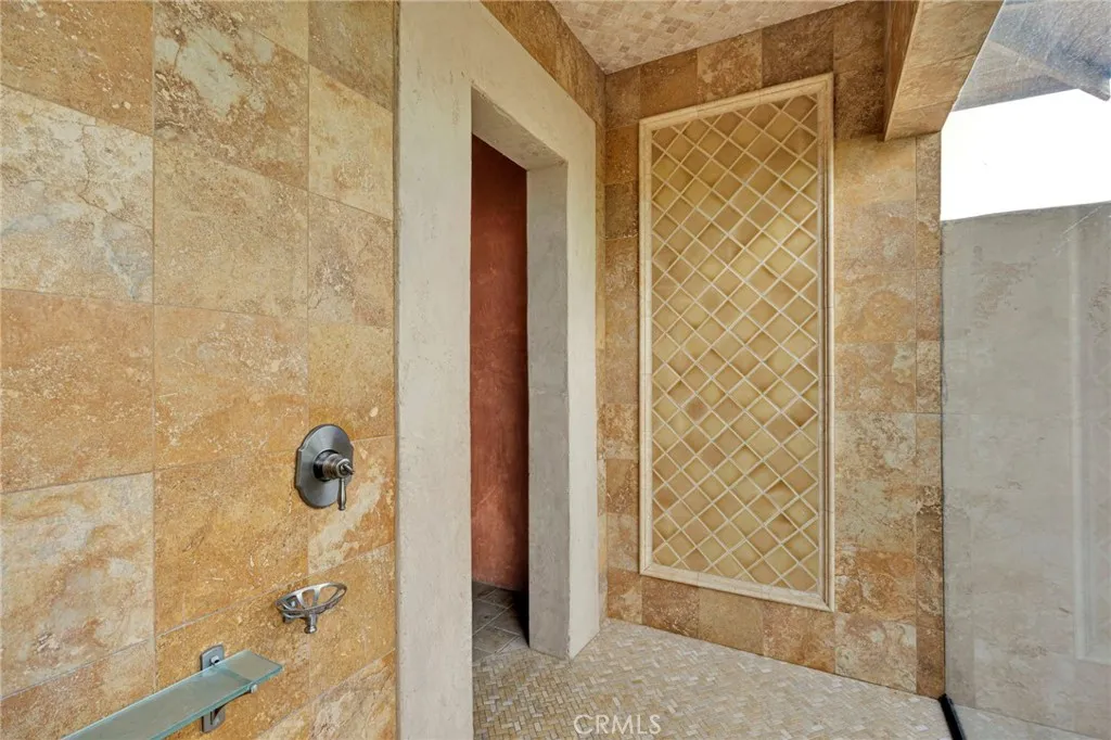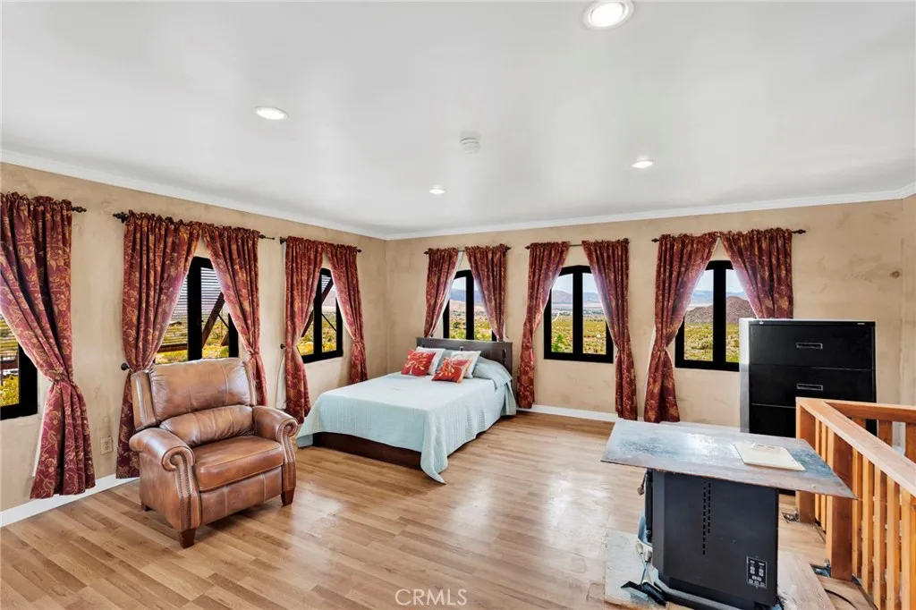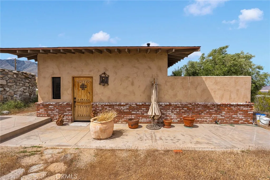 Spanish-style Hacienda! Paid Solar on five expansive acres in the Mojave Desert presents a distinguished residence of exceptional character and superior construction quality. The property commands unobstructed 360 degree valley panoramas visible from virtually every window throughout the home. The interior encompasses 1764 square feet of thoughtfully designed living space, featuring soaring beamed ceilings and an open-concept layout bathed in natural light. Custom patterned travertine tile establishes an immediate sense of refined craftsmanship. The chef's kitchen is appointed with marble countertops, custom cabinetry, an upgraded slide-in stove, artisan tile backsplash, and a farmhouse sink with coordinating faucet. The primary bedroom showcases patterned brick flooring and a glass door providing direct access to the remarkable backyard. A second-story loft offers versatile functionality as a game room, additional bedroom, or office with outstanding views. The custom walk-in atrium shower, featuring floor-to-ceiling glass overlooking a planted atrium of trees and shrubs, represents a truly distinctive architectural element. Outdoor amenities include a covered patio, front porch, barbecue island overlooking the pool and valley, a generous circular fire pit with dedicated entertaining area, and a gazebo collectively forming an exceptional outdoor living environment. The property's infrastructure is equally noteworthy. Paid solar with battery backup operates independently or grid-connected, supplemented by three mini-split systems, an evaporative cooler, and a wood-burning s