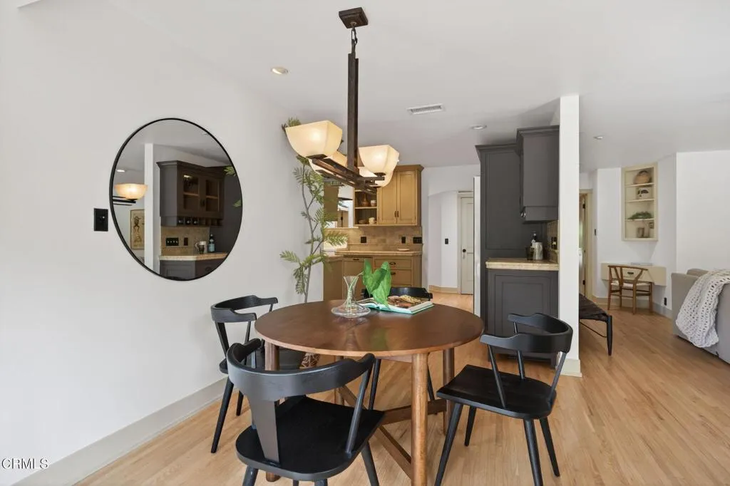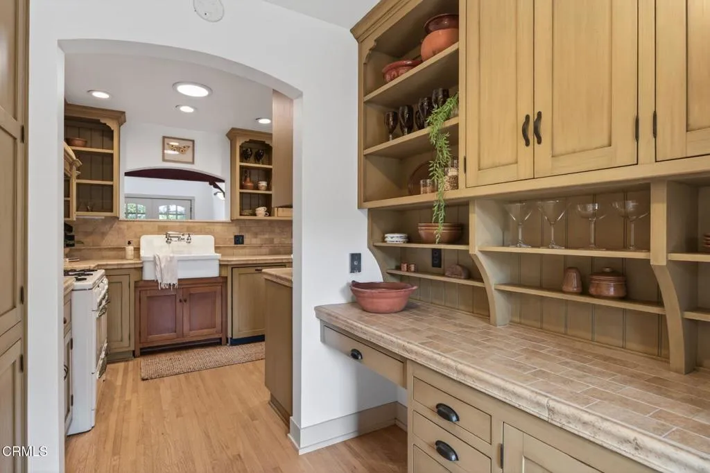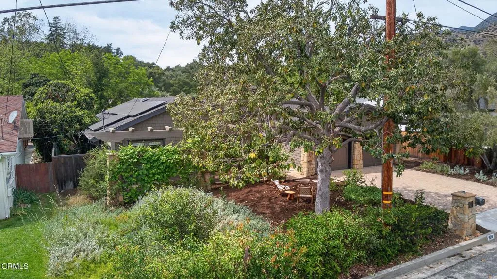 Thoughtfully designed single-level Arts and Crafts home with 2,110 sq ft, 3 bedrooms plus office, 2 baths, and a two-car garage. Warm wood floors, abundant natural light, and a functional layout with two bedrooms and an office on one wing and a private primary suite on the other. The primary suite features a fireplace, walk-in closet, French doors to a private patio, and an ensuite bath with soaking tub and separate shower.The kitchen is a true Craftsman expression, centered around an authentic vintage stove and complemented by ornate cabinetry, rich tilework, a dedicated workstation, and pantry area. Formal dining overlooks the backyard, while the living room offers built-in bookshelves, a fireplace, and sliding doors that open to the deck with mountain views.The 10,454 sq ft lot is thoughtfully designed as a curated native plant garden, featured in the 2024 Re-Wild Ojai Native Garden Tour, with meandering pathways and a variety of edible plantings including elderberry, currant, wild grape, chia, pomegranate, black fig, mulberry, persimmon, olive, and blackberry. A custom-built tool shed designed as an art piece and a sculptural stone water feature enhance the property's unique character. Additional features include owned solar and French doors in the office and one guest bedroom. A rare blend of location, design, and natural beauty in the heart of Ojai.