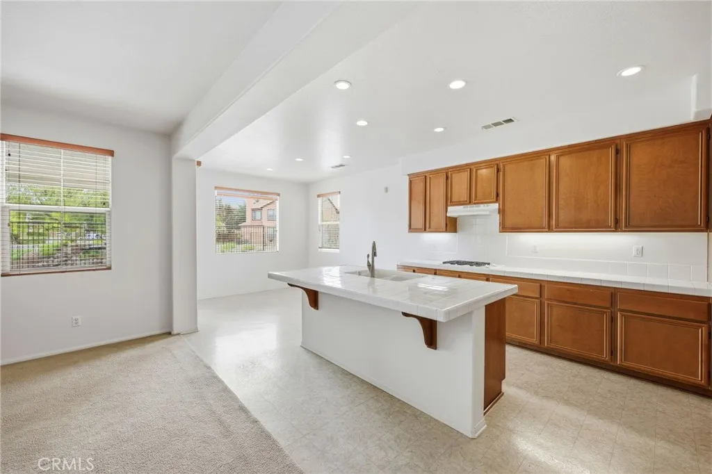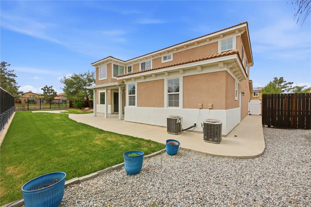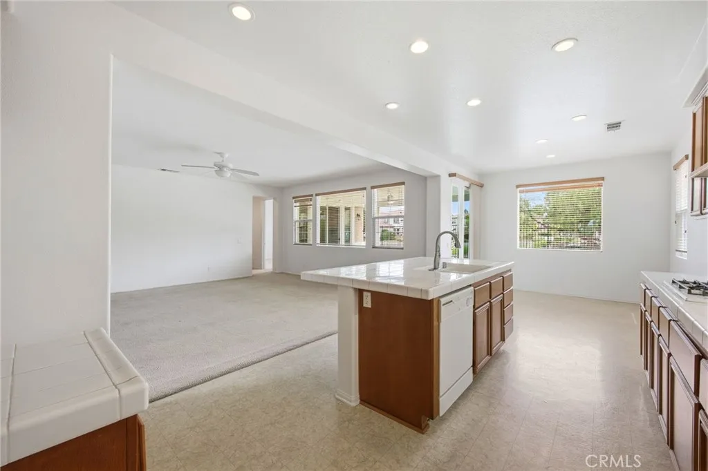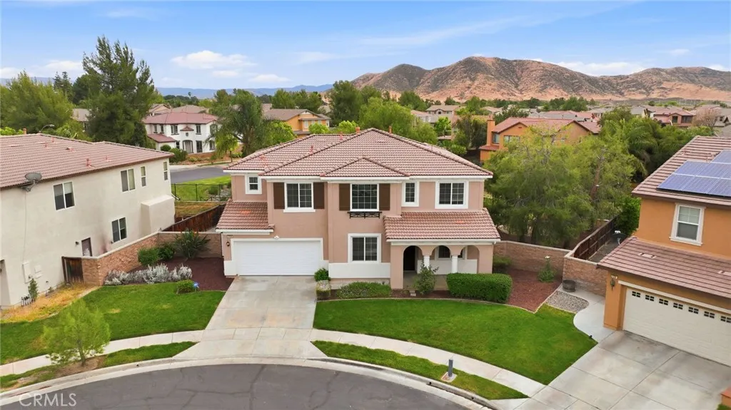 Located in the gated Willowalk Community of Hemet, this well-maintained 5-bedroom, 4.5-bath home sits on a quiet cul-de-sac and offers approximately 3,511 sq ft of well-designed living space on a 10,019 sq ft lot with a 3-car tandem garage. The open floor plan features a formal living room, formal dining area, and an expansive family room with fireplace that flows into a spacious kitchen with ample cabinetry and counter space, a large center island, butlers pantry, and breakfast nook overlooking the backyard waterfall. The interior has been refreshed with new paint throughout, giving the home a clean, move-in-ready feel. The main level includes a private bedroom suite ideal for guests or multi-generational living, along with a large individual laundry room with built-in counters and utility sink. Upstairs offers four additional bedrooms, three full bathrooms, and a spacious loft with built-in desk that can serve as a second living area, TV room, or game room. The primary suite features a retreat area and dual closets, while the primary bathroom includes dual vanities, a soaking tub, and separate shower. Two secondary bedrooms share a Jack and Jill bathroom with dual vanities. The backyard is fully improved with a covered patio, concrete hardscape, mature landscaping, and fruit trees, all positioned to capture lake and waterfall views, creating a private setting for both entertaining and everyday living. Residents enjoy resort-style amenities including a pool, clubhouse, basketball court, playground, and scenic walking trails with lakes and water features, making this a stan