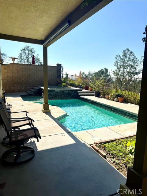 Located in the prestigious Hawks Pointe Community, a gated neighborhood with a staffed guard gate, this beautifully designed home offers privacy, scenic views, and an ideal floor plan for both everyday living and entertaining. Upon entry, you are welcomed by a dramatic living room with high ceilings, creating a bright and inviting first impression. Adjacent to the living room is a formal dining room featuring French doors that open to a private courtyard, perfect for indoor-outdoor dining and gatherings. Beyond the dining area, the family room flows seamlessly into the kitchen, creating an open and functional living space. The family room features a cozy fireplace and ceiling fan, while the kitchen is equipped with a large center island, ideal for meal prep, casual dining, and entertaining. A convenient half bathroom is located on the main level for guests. Upstairs, the laundry room is thoughtfully positioned for ease of use. The second floor offers four bedrooms and two full bathrooms, highlighted by a spacious primary suite. The primary bedroom features a private balcony where you can enjoy stunning city and mountain views. The primary bathroom is generously sized and complemented by a large walk-in closet. The backyard is designed for relaxation and entertainment, featuring a swimming pool and a covered patio. Both the backyard and the primary balcony offer beautiful city and mountain views. A tandem garage provides ample parking and storage space.