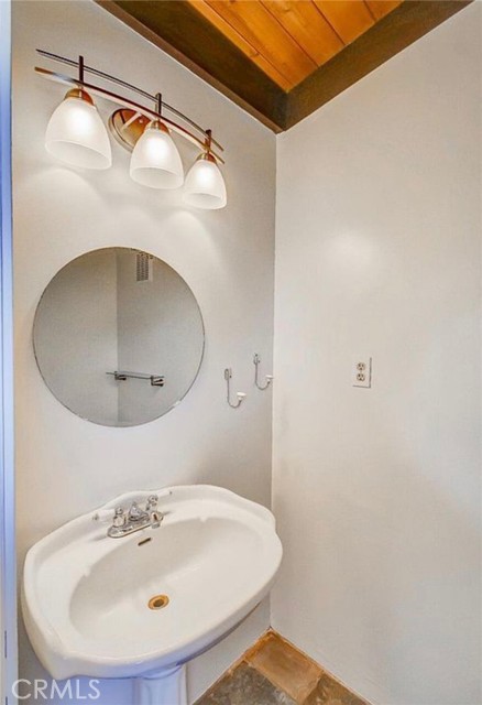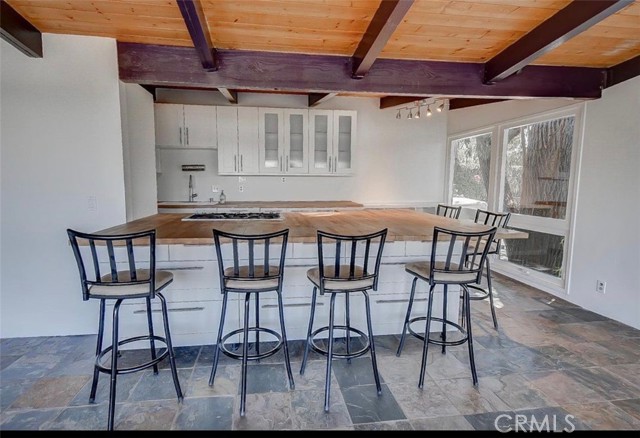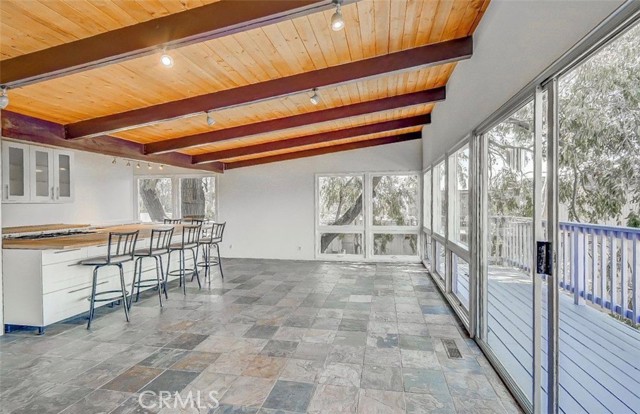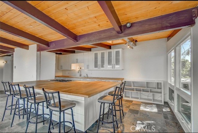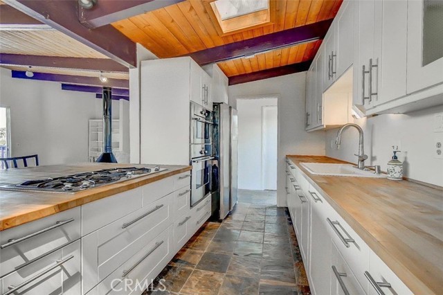 The main living area features vaulted wood plank ceilings with exposed beams, slate flooring, and expansive windows that bring in beautiful natural light. A freestanding fireplace anchors the space, and sliding doors open to a deck and balcony overlooking the canyon. The kitchen includes wood countertops, gas range, dishwasher, refrigerator, and skylight, with plenty of cabinet space and prep area.