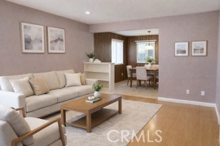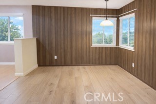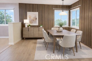 Step inside to an inviting layout featuring updated wood-look flooring, recessed lighting, and fresh neutral tones throughout. The spacious living area flows seamlessly into the dining space, highlighted by warm wood-paneled accents and large windows that bring in natural light.