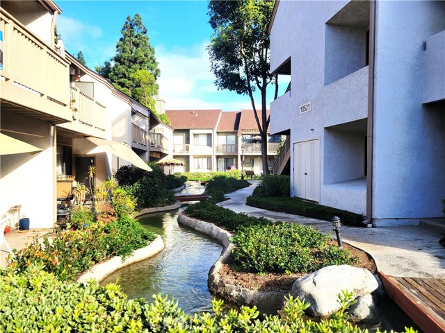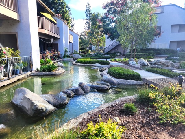 Enjoy living in the Lakeside Condo Community in a one bedroom one bath upstairs end unit with its own private staircase, entrance and a private washer & dryer. Other features include a vaulted ceiling, fresh paint, laminate floors, an upgraded kitchen with a new stove, dishwasher, microwave and refrigerator and an updated bathroom with a new bathtub/shower, flooring, sink and toilet. There is natural light throughout, a large walk in closet with shoe shelves, and a carport right next to the private staircase. Take a stroll along the the interior paths leading to the association pools, spas and clubhouses while listening to water falls and watching the koi fish swimming in the streams or you can walk to Main Street restaurants, farmers market and shopping. This is a great opportunity to rent a great condo!