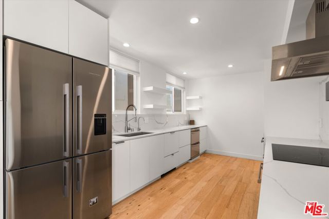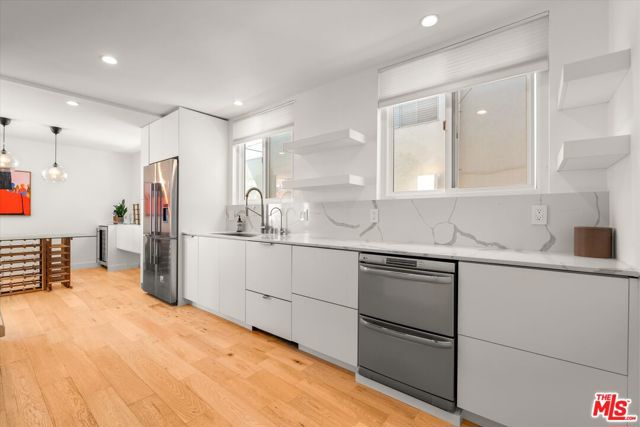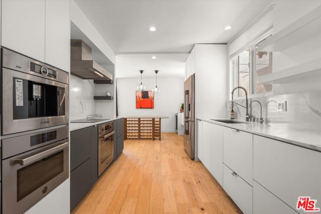 Discover modern comfort in this charming 2-bedroom, 2-bathroom end-unit condo nestled in the heart of Santa Monica! This inviting home features an open floor plan with elegant hardwood floors and recessed lighting throughout. Brand-new windows infuse every room with natural light. The living room opens to an outdoor patio, while the dining area flows seamlessly into the living space, complete with a wine fridge for your entertaining pleasure. The kitchen is a culinary haven, equipped with Bosch appliances, high-end coffee maker, and an electric stove, with a convenient gas connection also available. The primary suite serves as a sanctuary, boasting a spacious bedroom, dual sinks, a luxurious rainhead shower, and a large walk-in closet. Additional conveniences include an in-unit washer and dryer. Situated in a charming 14-unit building, this condo offers two parking spaces and storage in the garage area. Experience a blend of style and convenience in this Santa Monica gem, just blocks away from Montana Avenue's best shopping, restaurants, and only moments from the beach and top-rated schools.