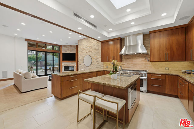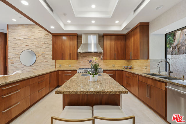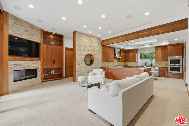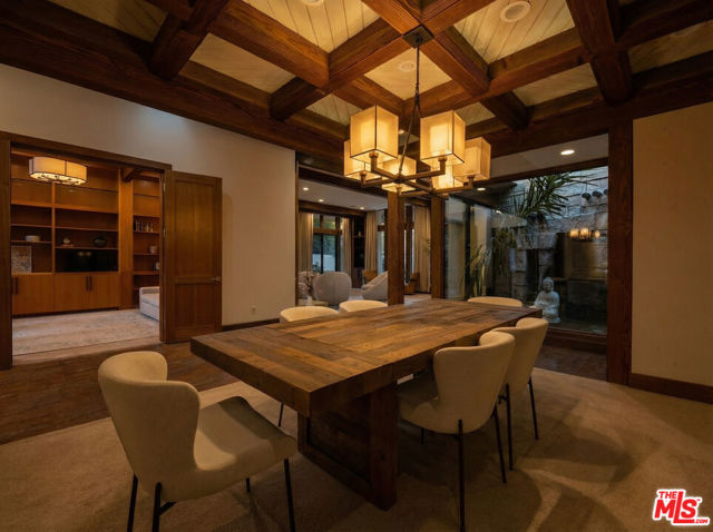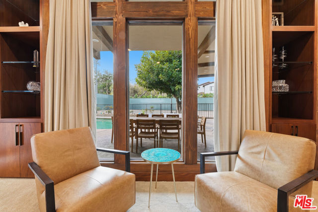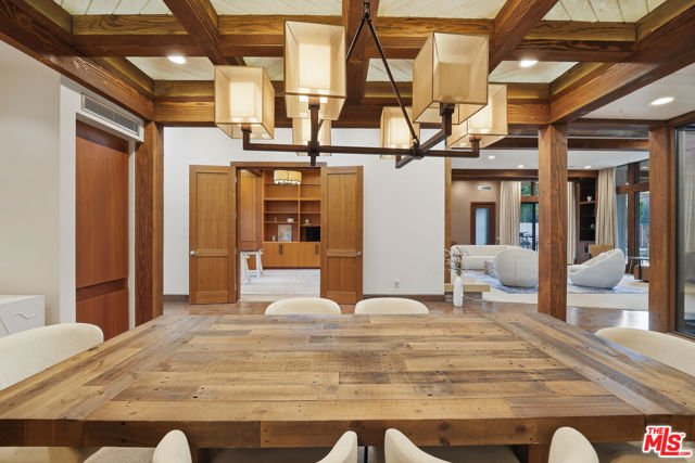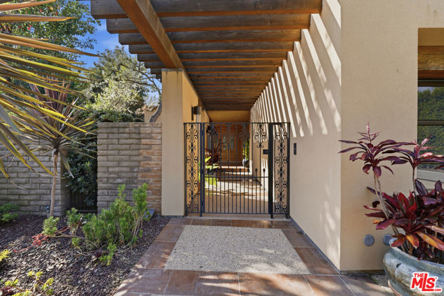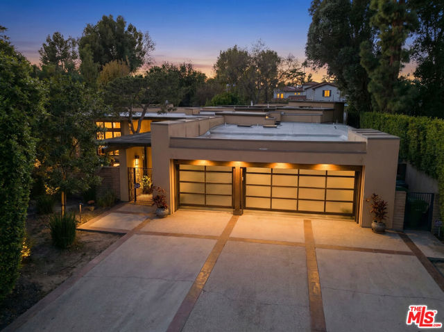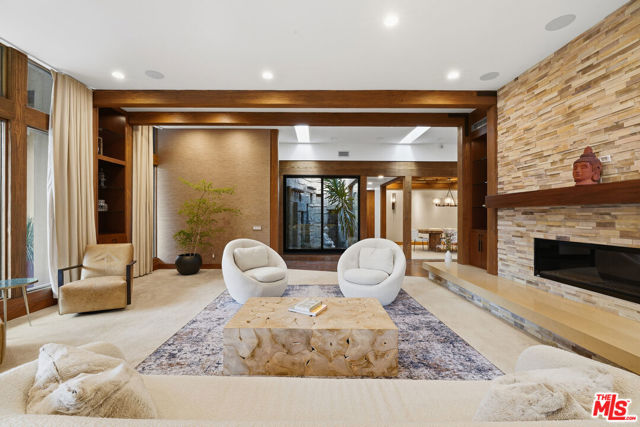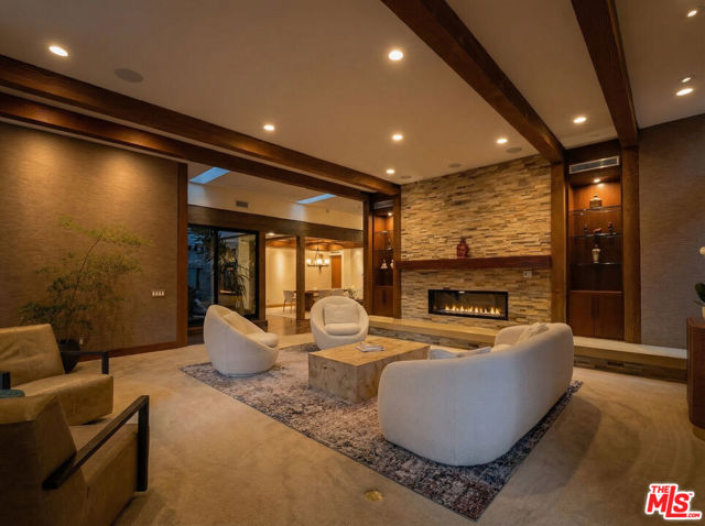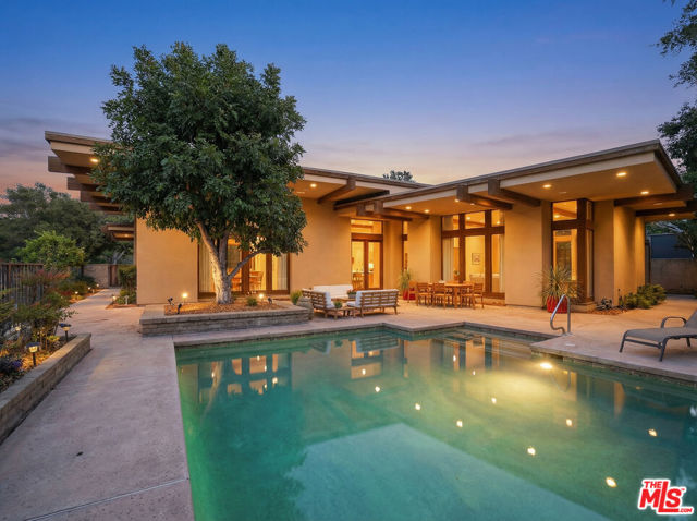 Welcome to a rare architectural masterpiece in the heart of prestigious Amestoy Estates. Rebuilt in 2014, this single-story mid-century modern estate blends timeless design with today's most refined luxury, offering an unparalleled living experience on a private cul-de-sac. Spanning approximately 3,835 square feet, this four-bedroom, three-and-a-half-bath residence is a true showpiece of craftsmanship and intention. Exposed wood beams, clerestory windows, skylights, coffered ceilings, and exquisite inlaid wood details create a warm yet sophisticated atmosphere, while stacked stone facades and designer lighting elevate every space. At the heart of the home, the great room flows effortlessly into a stunning open-air atrium with cascading waterfalls and lush greenery. A serene, resort-style focal point that blurs the line between indoor and outdoor living. Custom built-in cabinetry, stone slab countertops, and heated floors reflect a level of quality rarely found. The gourmet kitchen is a chef's dream, featuring premium Thermador appliances, a dual-oven gas range with custom hood, two wall ovens, built-in refrigerator and dishwasher, walk-in pantry, and elegant finishes ideal for both entertaining and everyday living. A sophisticated wine bar completes the experience. The primary suite is a private sanctuary with its own fireplace, spa-inspired bath with jetted soaking tub and steam shower, and luxurious finishes throughout. Three additional bedrooms offer walk-in closets with cedar paneling and automated lighting, providing both beauty and function. Modern comforts include solar panels, a whole-house water filtration system, dual tankless water heaters, dual HVAC systems, a dedicated utility room, and a three-car garage with epoxy flooring and custom storage cabinetry. Step outside to your private resort-style backyard, where you will find a full tennis court alongside a sparkling pool perfect for both active living and elegant entertaining. This is not simply a home, it is a statement of lifestyle, design, and distinction. A one-of-a-kind opportunity in one of Encino's most coveted neighborhoods.