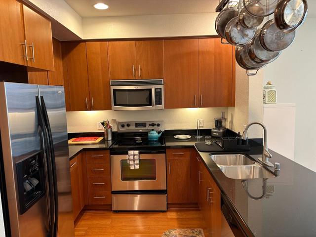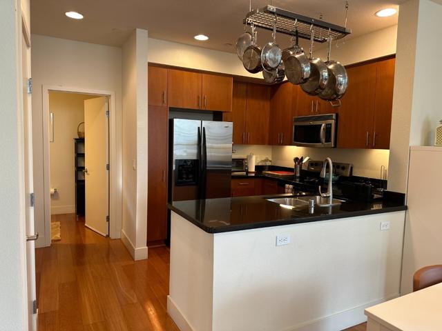 Discover luxury living in downtown Campbell. This 2 bedroom, 2.5 bathroom home with 1,454sf± of living space boasts high ceilings, 2 spacious suites, and large windows offering abundant natural light! The open kitchen seamlessly flows into the family room, creating a perfect great room ambiance. Granite counters and stainless steel appliances adorn the kitchen, complemented by a built-in desk suitable for your home work station. Both upstairs bedrooms are en suite, both featuring double sinks and generous tubs for relaxation. Ample storage is provided by spacious walk-in closets in each bedroom. The convenience of an upstairs washer and dryer adds to the modern living experience. This home exudes style and comfort. Park Town Place offers controlled access into the building. 2 dedicated parking spaces in the below building parking area, providing convenience. Located next to The Cannery, you'll be a stones throw away from vibrant local amenities. Elevate your lifestyle in this sophisticated and well-appointed home!