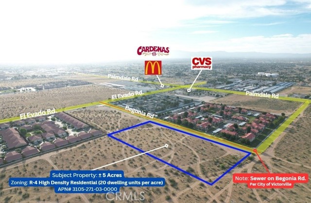 Maximum Density: R-4 zoning allows up to 30 units per gross acre, providing a potential yield of 150 units on a 5-acre footprint. Versatile Development: ldeal for large-scale apartment complexes, luxury condominiums, or income-restricted projects. Incentivized Growth: Benefit from reduced parking requirements (1 space per studio/1BR) for senior or affordable housing developments. Prime Visibility: Situated on a primary arterial with 28,000+ cars per day, offering immediate access to the 1 -15 and US-395 corridors. The "Live-Work-Play" Location: Your future tenants will be steps away from major retail anchors, including Walmart, starbucks, and Cardenas Market. With over 1,300 units recently approved nearby, this site sits at the heart of a massive residential influx.