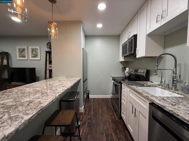 Fully furnished and fully renovated in 2023, this stunning 1BD/1BA condo in Walnut Creek’s sought-after Greenwood community delivers the ultimate turn-key lifestyle. Thoughtfully redesigned from top to bottom, this designer home pairs high-end finishes with curated West Elm furnishings for a polished, move-right-in experience. Highlights include CALI bamboo flooring, solid core pocket doors, stainless steel appliances, marble countertops in kitchen and bath, and a Kohler semi-professional faucet. The spa-inspired bathroom features a bespoke vanity mirror with striking gold foil-style wallpaper. The bright open living space flows to a private balcony with warm bistro lighting—perfect for evening wind-downs. Inside, soft Edison lighting sets a warm, inviting vibe throughout. Furnishings include a Sealy queen bed, West Elm walnut art display coffee table and media console, plus brass-ended walnut curtain rods with European linen curtains. Resort-style gated community with 3 pools, spa, sauna, gym, clubhouse, and lush greenbelts. Covered parking with extra storage. Prime location near downtown Walnut Creek, BART, Iron Horse Trail, shopping, dining, John Muir Hospital, and easy freeway access. A rare, fully furnished designer lease opportunity.