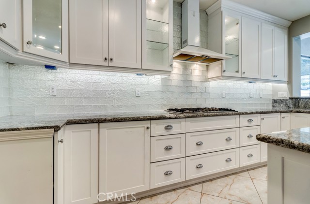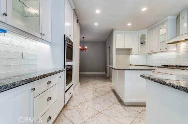 The gourmet kitchen is thoughtfully designed with a large center island with seating, granite countertops, a farmhouse sink, a double gas oven, drawer microwave, and custom cabinetry featuring decorative glass and mirror accents. An additional casual dining area completes this inviting space.