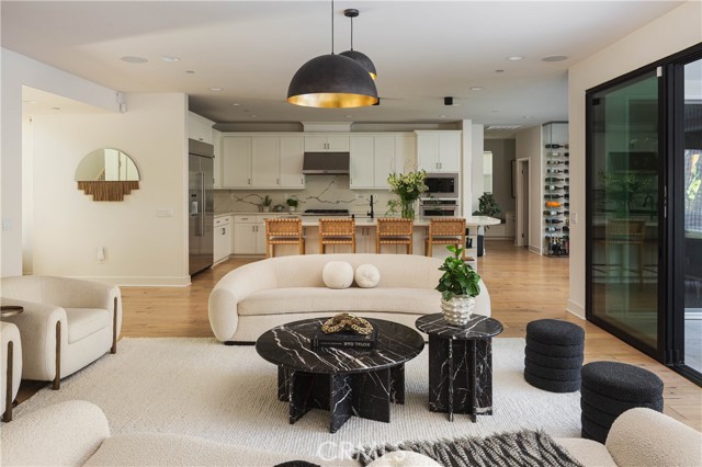 Beautifully constructed in 2018 by Melia Homes, this modern coastal residence sits within an exclusive enclave of just twelve homes. Every detail of this two-story, 3,600-square-foot home has been thoughtfully enhanced by its current owner, blending refined design with resort-style living. Inside, the first floor is entirely clad in wide-plank white oak flooring and framed by 10-foot ceilings. A downstairs bedroom with separate entrance offers flexibility for guests or a home office. The open-concept layout flows seamlessly from the kitchen to the dining and living areas, where wall-to-wall sliding glass doors open on two sides—creating an effortless indoor-outdoor connection to the entertainer’s backyard; Newly reimagined & completed by Pool Logic in 2022 it is a true private resort. The Pebble Tec pool, shimmering with an abalone and mother-of-pearl blend, features built-in seating, a shallow sun shelf for in-water lounging, and a waterfall-edge spa constructed from solid marble slabs with a spillover design. Entertain beneath the stars with a Fontana pizza oven, flat-top grill, outdoor refrigerator, and outdoor shower—all framed by a modern fireplace and 3D illuminated wall art that transforms the space after dark. The chef’s kitchen is outfitted with an all-stainless KitchenAid appliance suite, including a built-in refrigerator and freezer, six-burner stove, and double oven, along with a built-in Bosch espresso maker and a striking 120-bottle glass wine wall adjacent to the dining area. Upstairs, a spacious bonus living room provides additional space for relaxation & entertainment while wired speakers throughout, Arteriors designer lighting, a Nest smart home system, and remote-controlled shades complete the elevated interior experience. Set within one of Eastside Costa Mesa’s most desirable areas, 311 Costa Bella Court delivers the perfect balance of modern design, privacy, and resort-quality amenities—every element thoughtfully curated to create a one-of-a-kind home experience.