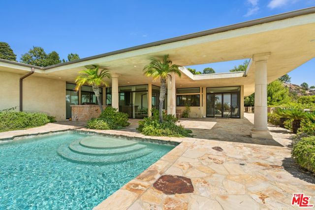 This exclusive gated estate in Trousdale presents an exquisite blend of luxury and comfort with 5 spacious bedrooms and 6 elegant bathrooms. The home features dramatic high ceilings and rich hardwood floors throughout. A grand entry foyer ushers you into expansive formal living spaces. The gourmet kitchen is a chef's dream, showcasing a central island, top-of-the-line appliances, and a charming breakfast area. The large family room includes a cozy fireplace, while the living room offers another inviting fireplace. The master suite is a private retreat with an extensive dressing area and dual bathrooms. All rooms open seamlessly to entertainer's patios, providing breathtaking canyon, city, and ocean views. Enjoy the sun-drenched swimmer's pool and spa, complete with a BBQ area for al fresco dining. The gated motor court provides ample parking for several vehicles, ensuring convenience and privacy.