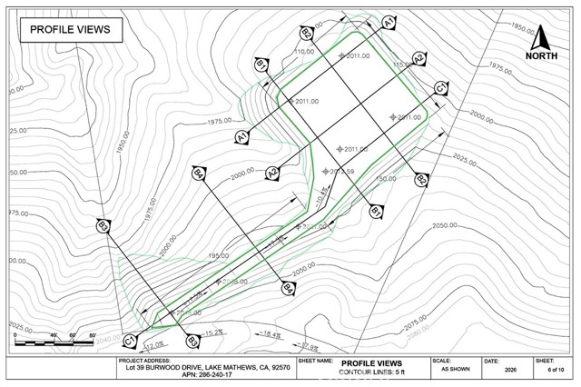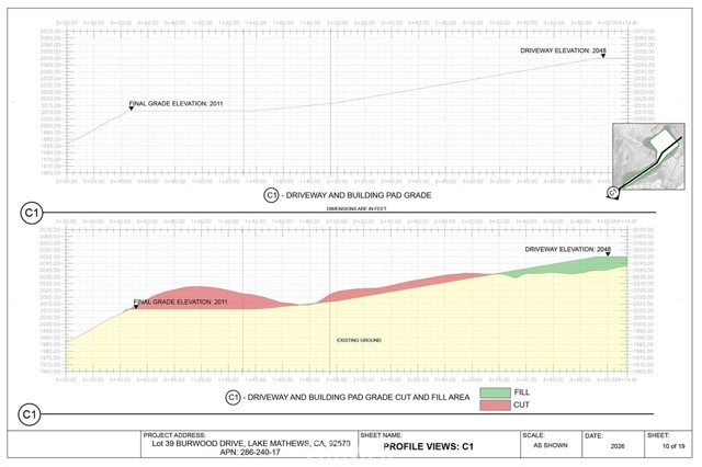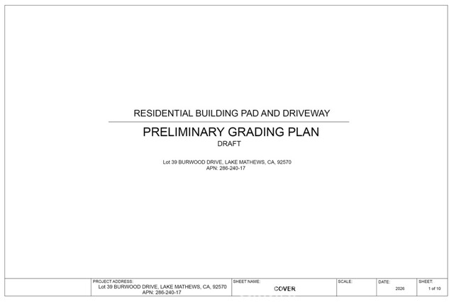 Preliminary engineering grading plans with computer 3D models, calculations and visualizations are included in the purchase. The plans include a 195 feet long driveway, a 115'x110' graded flat pad for a 4000 square feet house and a 4000 square feet garage to store cars, RVs, boats, motorcycles, or any of your toys. No restriction on build type: from luxury mansion through large custom home to a small home, prefabricated homes to mobile homes, Lake Mathews is developer friendly.