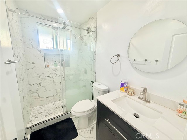 The upgraded bathroom showcases contemporary finishes, designer tile work, and a glass enclosed shower. Washer and dryer are included for your convenience.