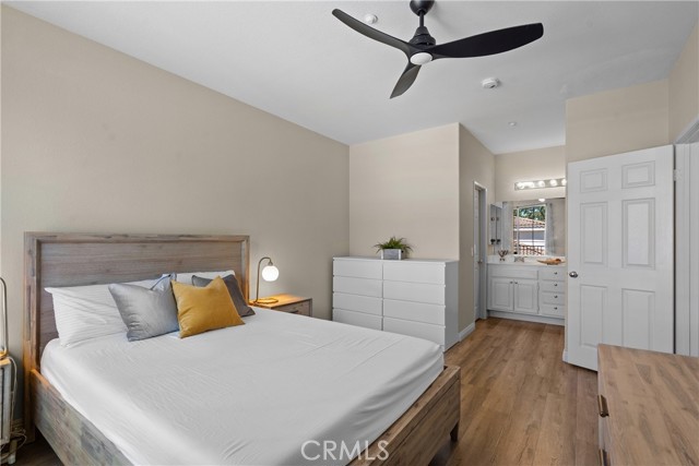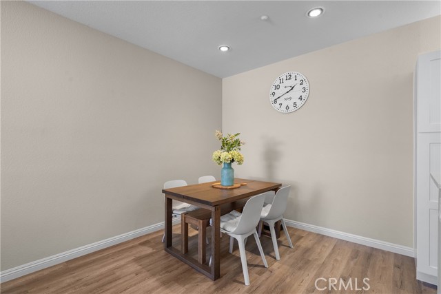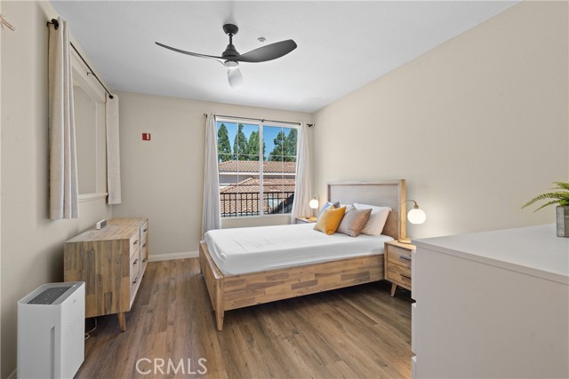 Bright and airy, the home features an open-concept living area with recessed lighting, wood flooring throughout, and a private patio perfect for relaxing. The upgraded kitchen includes shaker cabinets, quartz countertops, stainless steel appliances, and a dining area. The spacious primary suite offers a ceiling fan and a walk-in closet. Recent upgrades include a newer A/C, furnace, and water heater, plus an EV charger in the garage.
