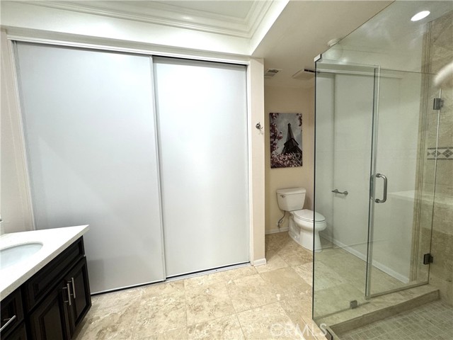 Large primary suite with double vanity and generous closet space