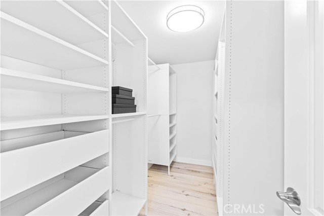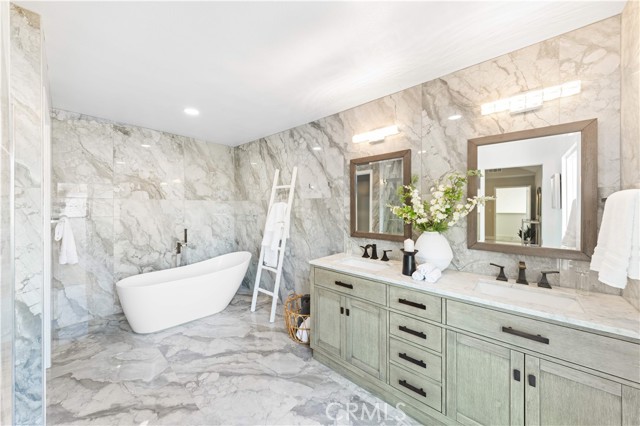 custom walk-in closet and built-in organizer systems. The primary bathroom is a standout, finished with floor-to-ceiling marble-look porcelain tile and featuring a