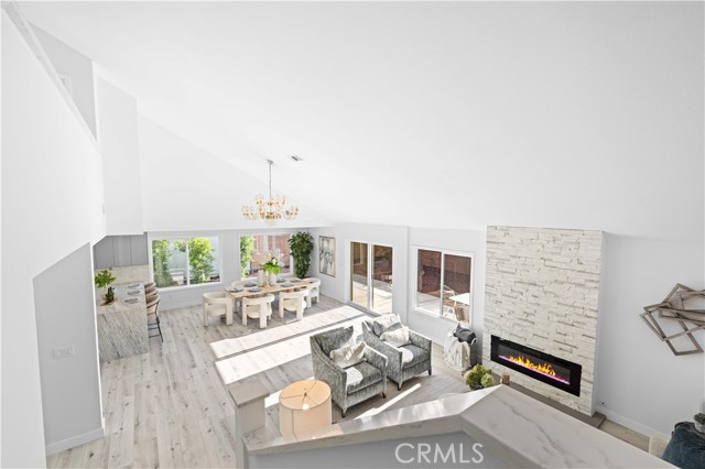 Inside, the living spaces are enhanced by elegant lighting, including crystal chandeliers, and a sleek LED electric fireplace that anchors the living room. The kitchen