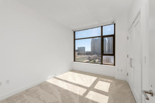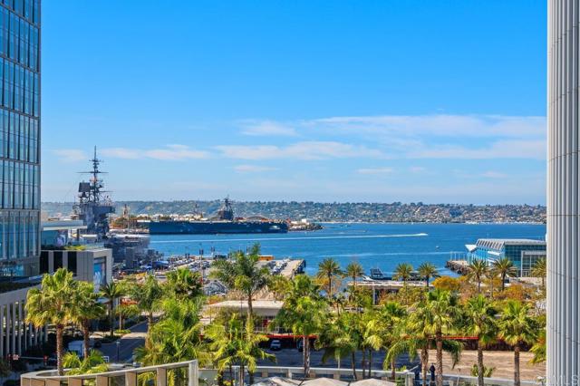 Perched on the 8th floor of the iconic Electra building, this beautiful home features 1315 square feet of meticulously designed living space with 2 bedrooms, 2 bathrooms PLUS a den. Nestled in the heart of San Diego's vibrant Columbia District, this property truly offers the ultimate urban lifestyle. Panoramic southwest-facing views of the bay, skyline, and the building's serene pool area. Upon entry, you're greeted by an abundance of natural light streaming through expansive windows, highlighting the open-concept layout. The living and dining areas seamlessly flow into a private balcony, perfect for al fresco dining or simply enjoying the views and coastal breezes. High-end finishes in the kitchen include stainless steel appliances and sleek slab granite countertops. The primary suite offers a tranquil retreat with two closets and a spacious spa-like bathroom featuring a soaking tub and separate shower. An additional bedroom and a versatile den provide flexibility for guests, a home office, or workout room. Additional features include fresh paint, new carpet in bedrooms, modern track lighting, and cozy living room fireplace. Residents of this boutique building enjoy a range of amenities, including a heated pool, spa, fitness center, and 24-hour staffed lobby. With a Walk Score of 96, you're just steps away from the waterfront, Seaport Village, Little Italy, and and some of San Diego's best dining and entertainment..