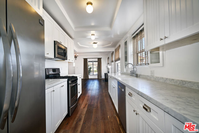 Fully remodeled by BetterShelter, this beautiful Spanish 3BR/2BA maintains all of its original charm, while still providing the comforts of a meticulous, modern reimagining! Enter the airy, open living room, complete with wide-plank oak floors, custom linen drapes, and a charming, decorative fireplace. The bright kitchen boasts stainless appliances, Carrara marble counters, and a separate laundry room with an abundance of storage and pantry space. The primary suite features dual closets, custom drapes, and a delightful ensuite bathroom. A guest bathroom and two additional guest bedrooms, each with French doors to the backyard and deck, round out the fabulous floor plan. Enjoy year-round entertaining and relaxing in the private, lush backyard, with its shady trees and grassy yard. The spacious and partially finished garage would make an excellent space for a home gym, bonus storage, or an office. Enjoy excellent proximity to Joe's Pizza, Bloom Cafe, Paper & Plastic, Sky's Tacos, LACMA, The Grove, and the 10 freeway.