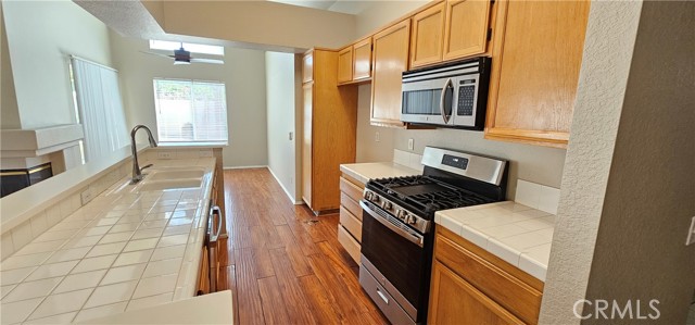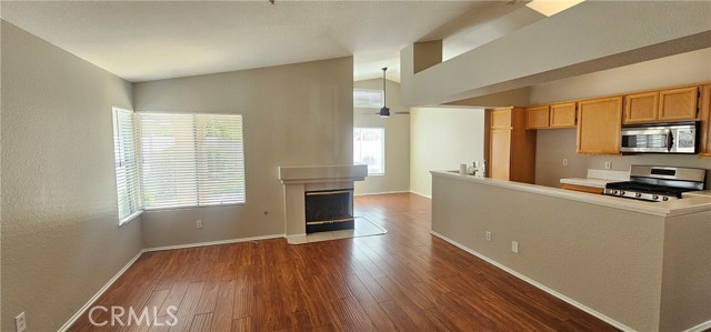 The functional kitchen offers ample cabinet storage and opens to a bright living area with an open-concept layout that allows for plenty of natural light throughout the home, creating a warm and inviting atmosphere.