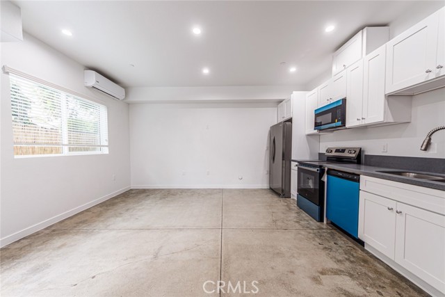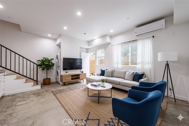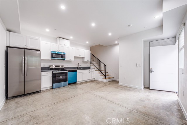 The main floor welcomes you with an upgraded kitchen complete with stainless steel appliances, crisp white cabinets, solid-surface countertops, and a stylish tile backsplash. Polished concrete floors and recessed lighting create a modern industrial vibe, while large windows and a wide-open living area offer tons of natural light.