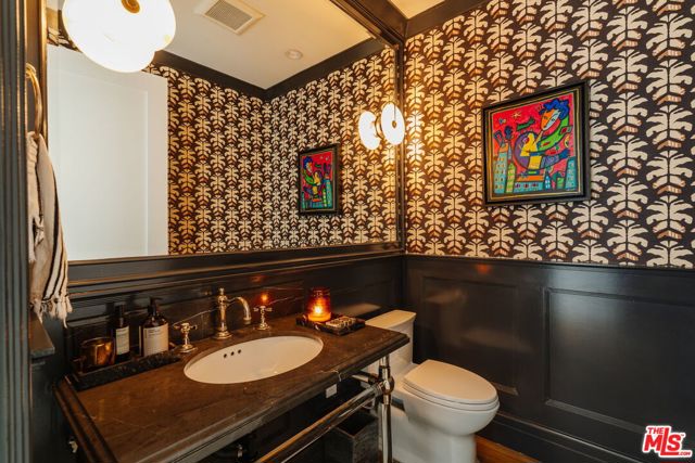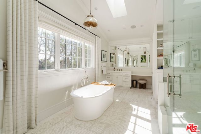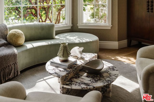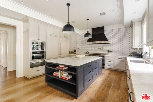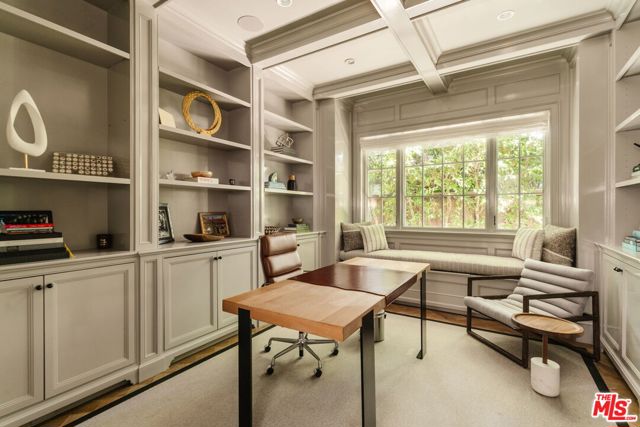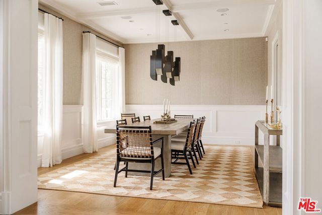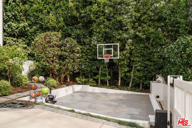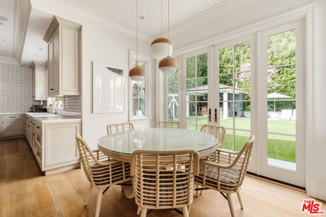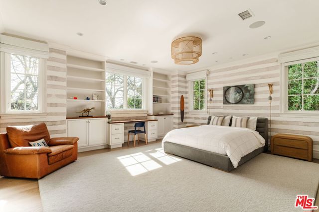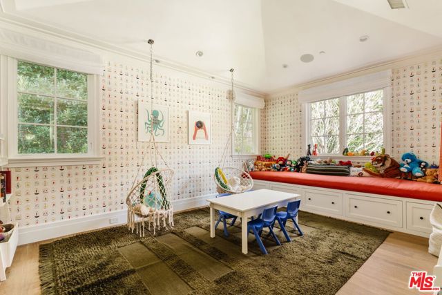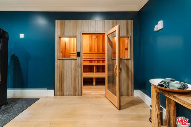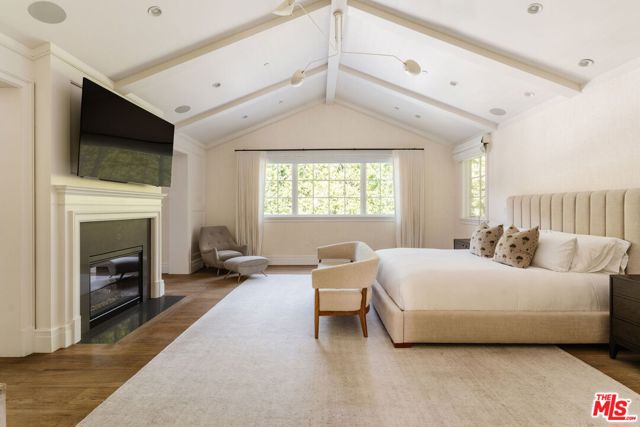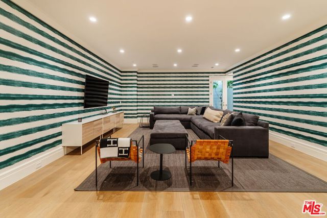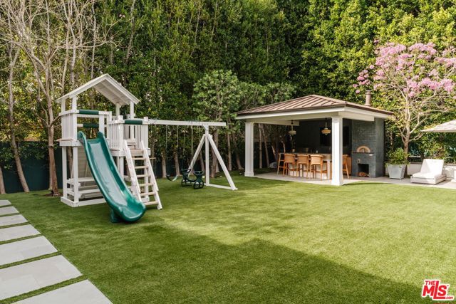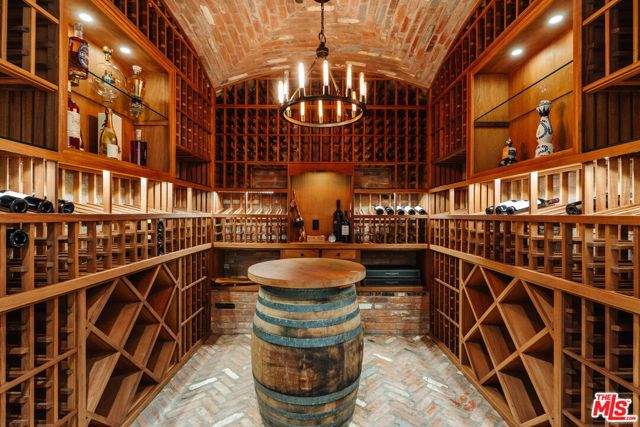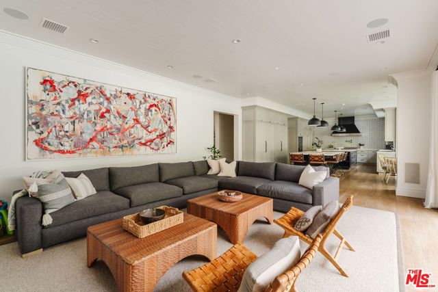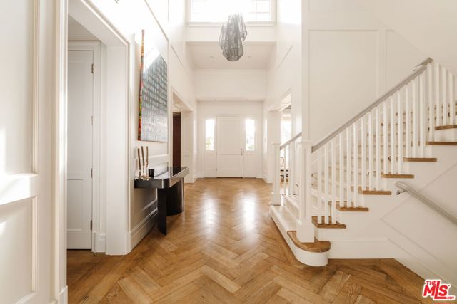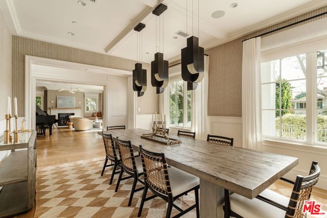 Set on one of the Palisades Riviera's most coveted streets, this beautifully designed, fully furnished Traditional estate offers over 8,637 square feet of refined living. Thoughtfully curated for both everyday comfort and large-scale entertaining, the home blends timeless architecture with sophisticated designer finishes throughout. Light-filled interiors unfold across three levels connected by an elevator, showcasing impeccable craftsmanship at every turn. Herringbone-pattern wood floors, tailored wainscoting, and coffered ceilings are just a few of the elegant details that elevate the home's warm, polished aesthetic. The main level features generous formal and casual living spaces, a dedicated office, and seamless indoor-outdoor flow to an exceptional backyard retreat. The resort-style grounds include a pool and spa, outdoor kitchen, expansive grassy lawn, play structure, and a covered dining and lounge patio with a fireplace creating a private oasis ideal for year-round enjoyment. Upstairs, five spacious bedrooms offer an ideal family layout, including a luxurious primary suite. The lower level is an entertainer's dream, complete with a temperature-controlled wine cellar, theater, gym, sauna, and two additional bedrooms perfect for guests or extended family.
