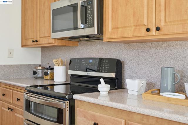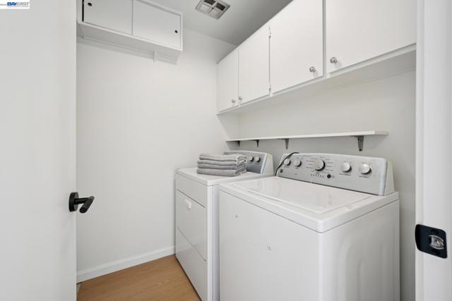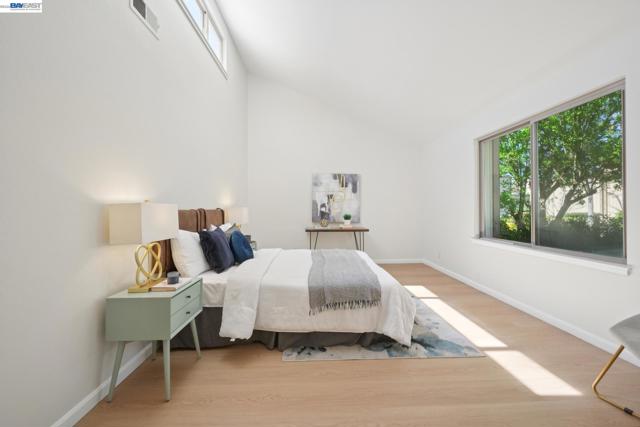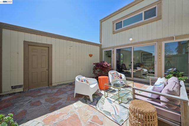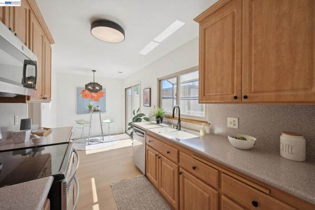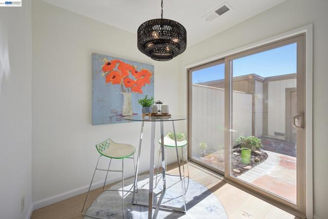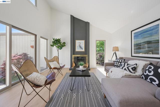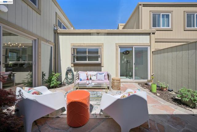 Built in 1969, this light-filled single-level townhouse offers 2 bedrooms, 2 bathrooms, and 1,274 square feet of comfortable living space. Vaulted ceilings create a bright, airy feel throughout, complemented by LVP flooring, fresh interior paint and a spacious living room with a fireplace. The dining area features a modern chandelier, while the galley kitchen includes an electric range oven, microwave hood, dishwasher and a breakfast nook with patio access. A dedicated laundry room with cabinetry adds convenience. The hall bathroom offers a shower over tub with updated fixtures and hardware. The primary suite features vaulted ceilings, a walk-in closet, and an ensuite bathroom. Step outside to a private courtyard—perfect for morning coffee, relaxing with a book, or dining al fresco. Enjoy the HOA clubhouse, pool common areas and plentiful guest parking spaces. Complete with a two-car garage and ideally located near walking and biking trails, top-rated schools, Corica Golf Course, and the Harbor Bay Ferry Terminal.