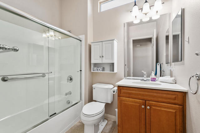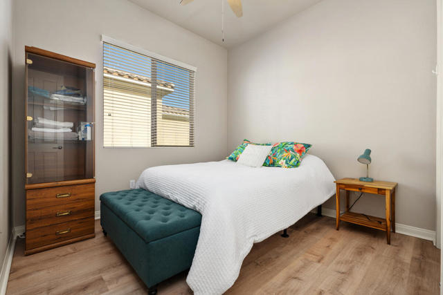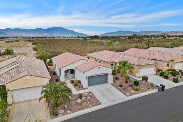 Welcome to this charming and freshly updated Canterra floor plan offering 1,257 sq. ft. of comfortable living space, ideally situated with a panoramic mountain view in Sun City Shadow Hills. The inviting great room features tile flooring, two large windows, and a sliding glass door that fills the space with natural light and provides easy access to the backyard. The kitchen showcases updated appliances with a newer refrigerator, dishwasher and microwave, granite countertops, and abundant cabinetry with room for a cozy breakfast nook. A separate laundry room adds everyday convenience. The AC was recently replaced in 2023 and heating system updated in 2024. The primary suite offers luxury vinyl tile, a large picture window overlooking the backyard and mountain views, a walk-in closet, and an ensuite bathroom with dual vanities and a shower stall. The guest bedroom, also with LVT flooring, is located near a full bath with a shower-over-tub combination perfect for visitors. The garage has been updated with insulated garage doors and built-in storage. Step outside to enjoy a spacious backyard featuring a covered patio, extended concrete area ideal for outdoor seating, and low maintenance desert landscaping. This beautiful move-in ready home was painted inside and out in the last 18 months. Sun City Shadow Hills is an active 55+ community offering resort-style amenities, including two clubhouses, championship golf courses, fitness centers, pools and spas, pickleball and tennis courts, and a variety of social clubs and activities designed for every interest. Enjoy the perfect blend of recreation, relaxation, and connection in this vibrant desert community. Don't miss the opportunity to make this inviting Canterra yours!