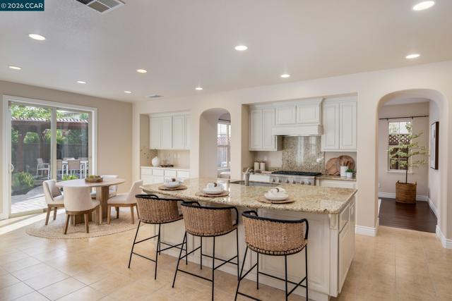 Welcome to the highly desirable Windemere community of San Ramon, a stunning corner-lot home offering space, flexibility, & effortless indoor-outdoor living. This expansive 5-bedroom, 4.5-bath residence spans 4,202 sq ft on a 0.24-acre lot, thoughtfully designed for comfort & entertaining. The heart of the home is the large eat-in kitchen with oversized island with bar seating, freshly painted cabinetry, SS appliances, built-in gas range with hood, double oven, microwave, breakfast nook, & abundant storage. Enjoy a seamless flow with a welcoming family room with fireplace opening to the backyard. A main-level guest suite with private exterior access is ideal for multi-generational living, plus flexible space for a home office. The backyard features a lush lawn & charming pergola, while a tranquil courtyard connects to a detached in-law unit with its own entrance. Upstairs, the bright primary suite offers dual vanities, soaking tub, stall shower, & walk-in closet. Two bedrooms share a Jack-and-Jill bath & balcony. Upstairs laundry adds convenience. Additional highlights include solar, 3 car garage & located near top-rated SRV schools, walk to parks & trails, close to Bishop Ranch, shopping & dining.