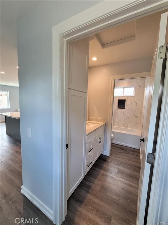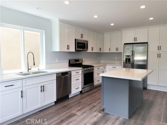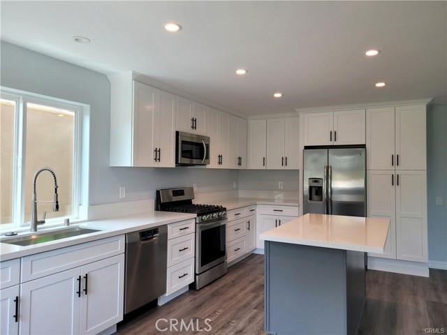 Inside, you’ll find a functional and inviting layout featuring a unique split bathroom with a pocket door that separates the sink area from the shower—ideal for added convenience and privacy. The spacious kitchen is a standout, showcasing luxurious quartz countertops, soft-close cabinets and drawers, a large center island, stainless steel appliances including a 5-burner gas range, and an impressive double pantry with abundant storage.
