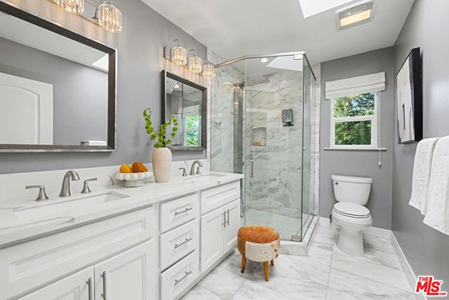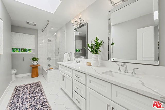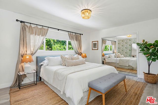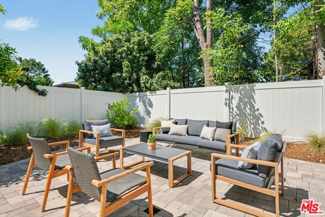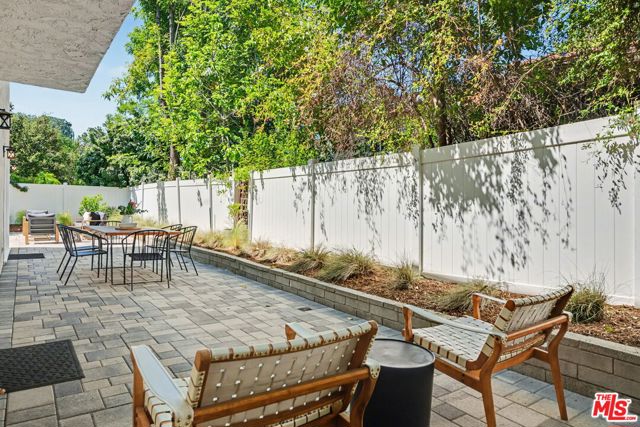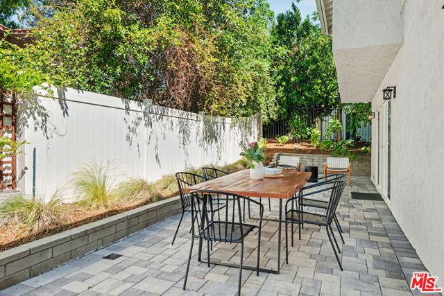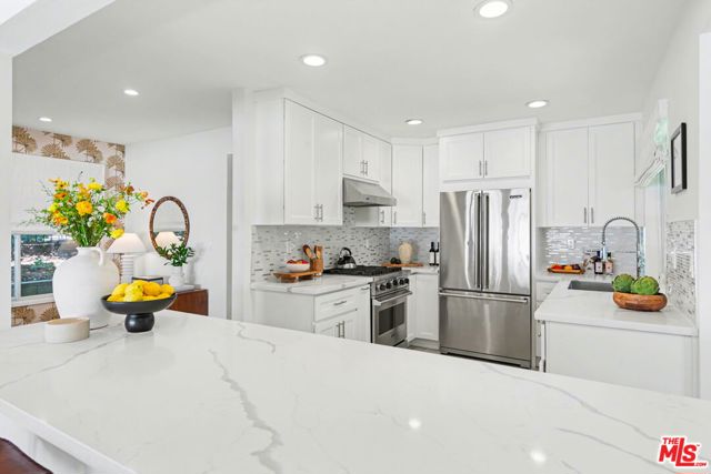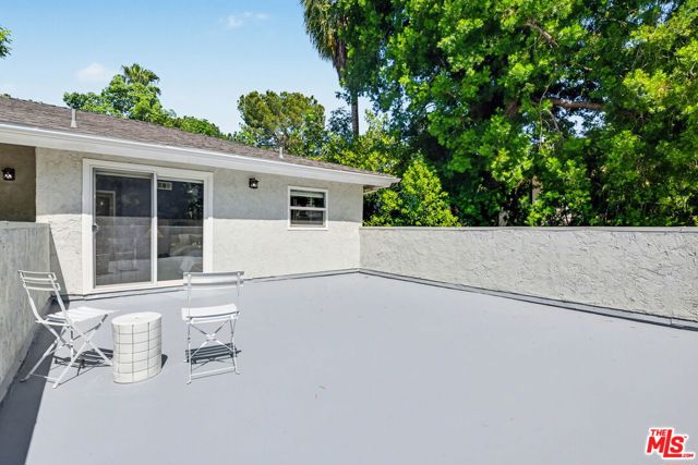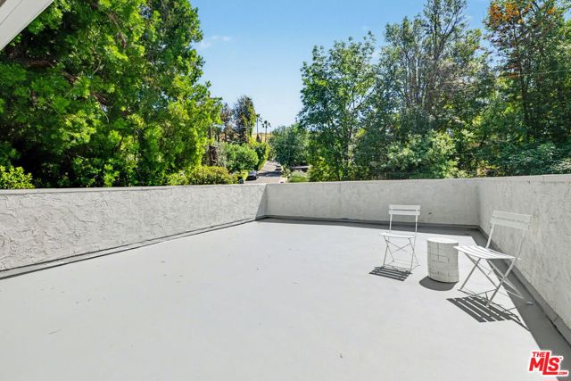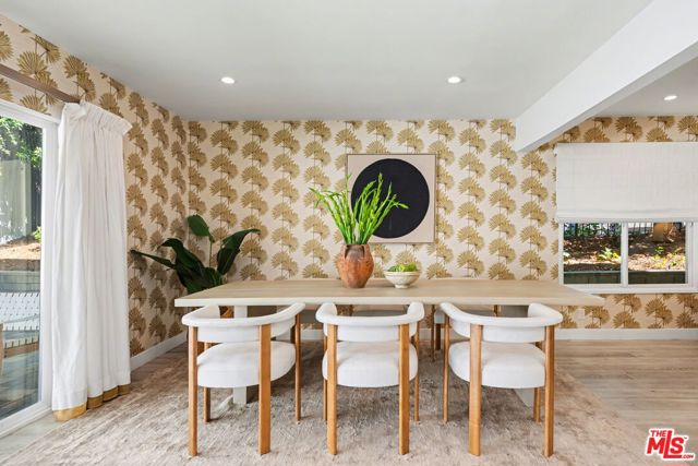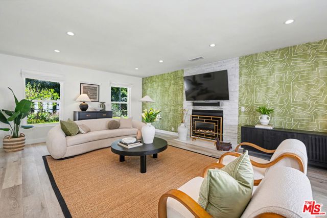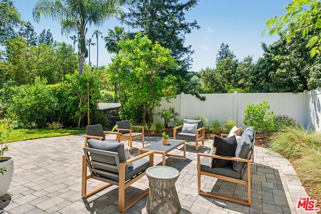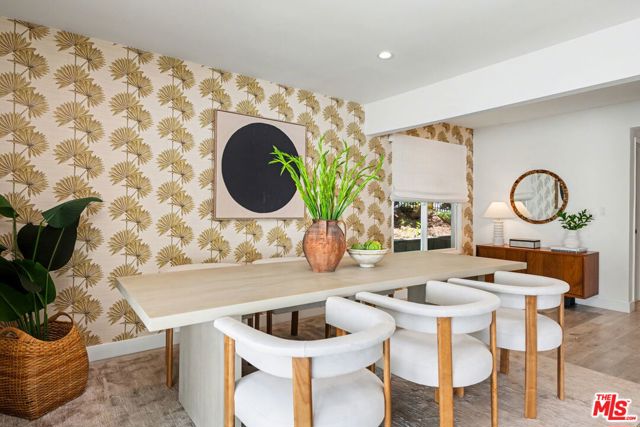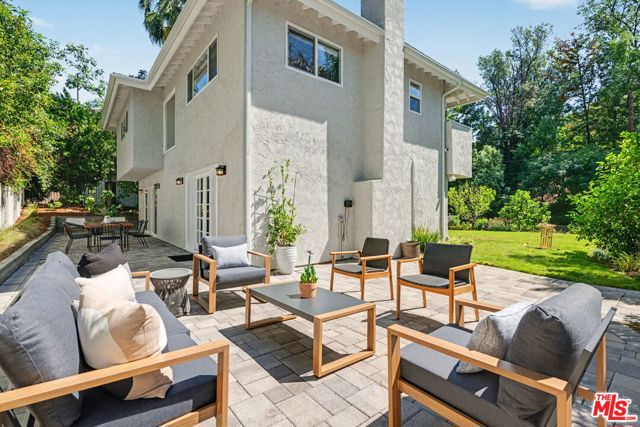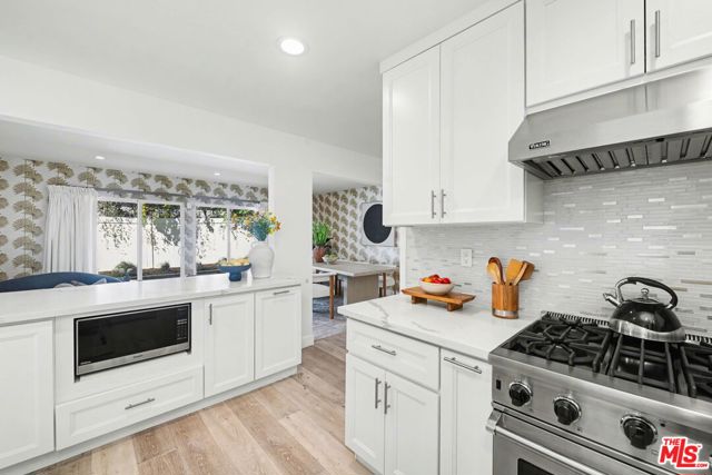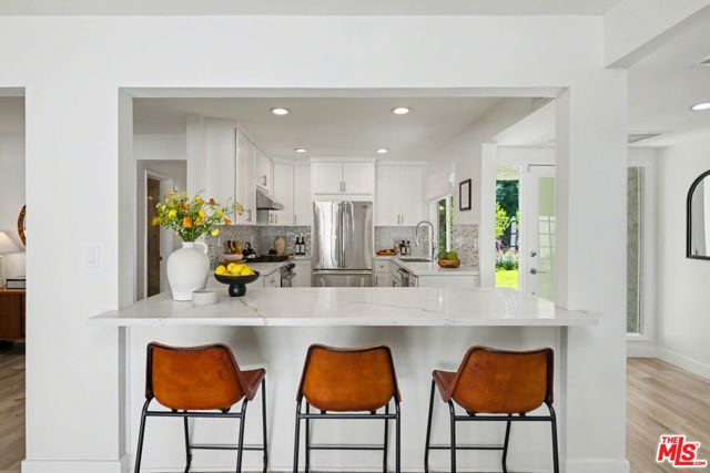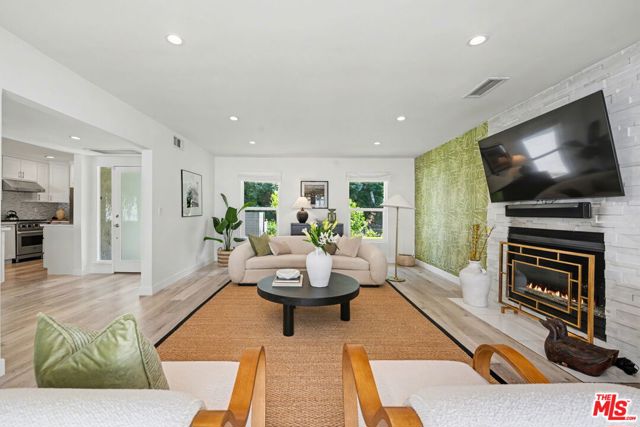 Tucked away South of the Boulevard on a quiet, tree-lined street in Woodland Hills, this thoughtfully remodeled home offers a sense of privacy, natural light, and effortless indoor-outdoor living. The living room features a stone fireplace and French doors that open to a landscaped yard with rose bushes, fruit trees, and unobstructed hillside views. The updated kitchen includes Viking appliances, white shaker cabinetry, quartz countertops, and a large island, which flows seamlessly into the dining and family areas with direct access to multiple patio spaces; well-suited for both everyday living and entertaining. A refined material palette carries throughout the home, including stone, quartz, and marble surfaces, complemented by patterned Moroccan tile and curated wallpaper accents that add subtle contrast and design detail. Upstairs, the primary suite offers a walk-in closet, vanity area, and a bath with a skylight, dual sinks, and marble finishes. Secondary bedrooms include one with access to a resurfaced waterproof deck and another with treetop views. Additional upgrades completed approximately five years ago include the roof, gutters, electrical panel, tankless water heater, and exterior hardscape. Conveniently located near Calabasas, with proximity to shopping and dining, including Bristol Farms and the Calabasas Commons.