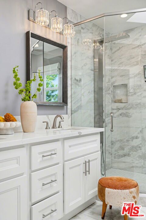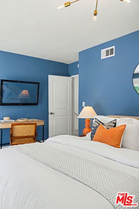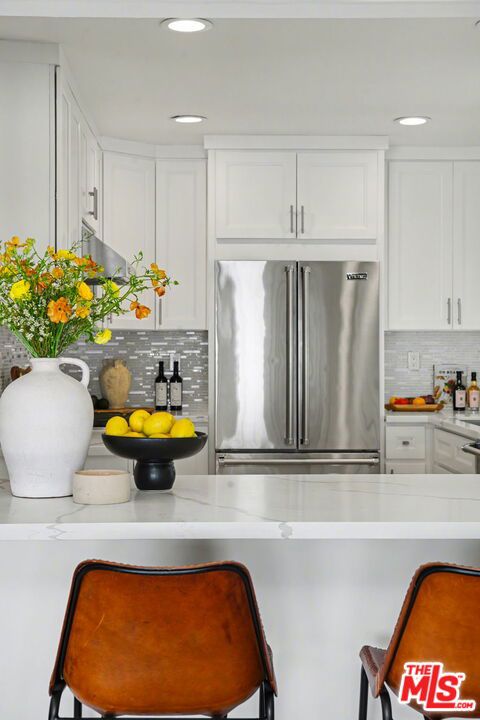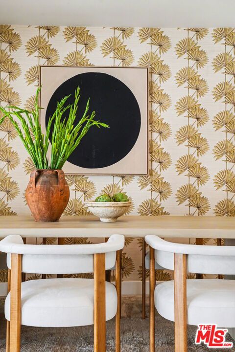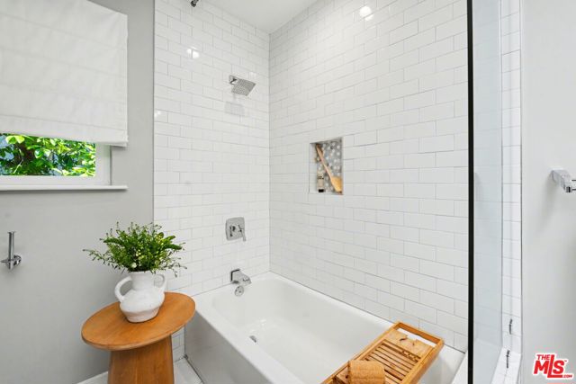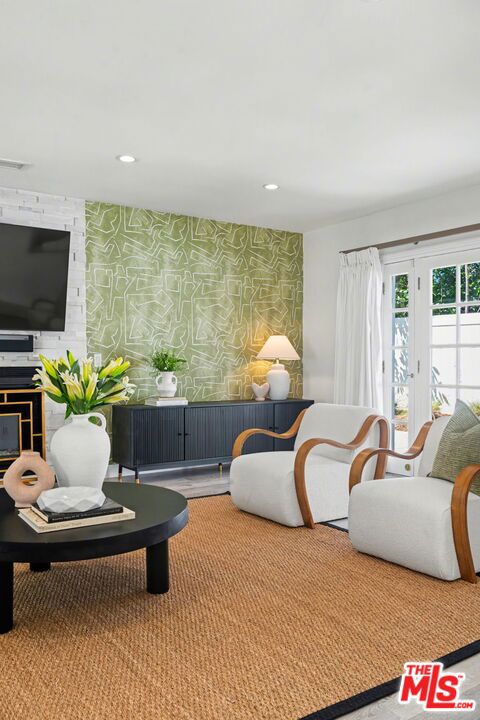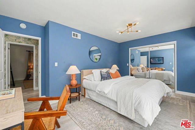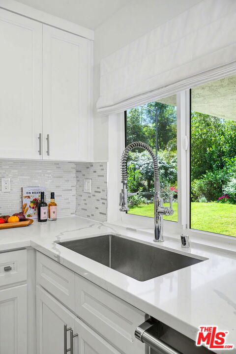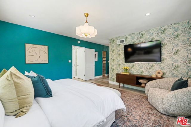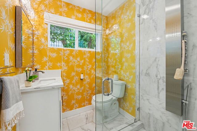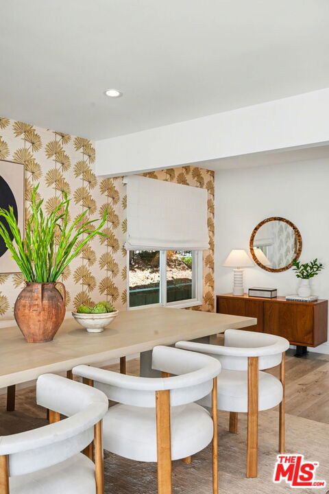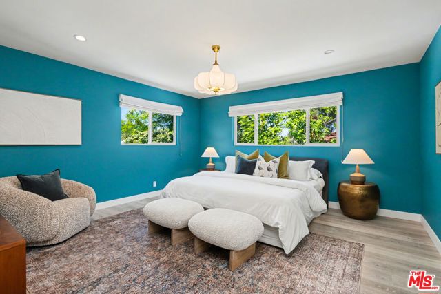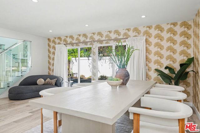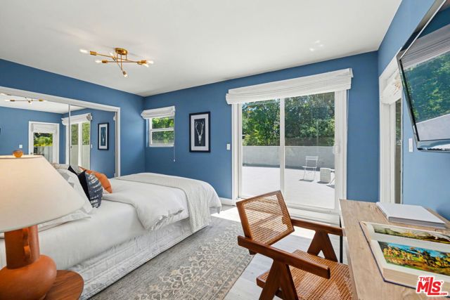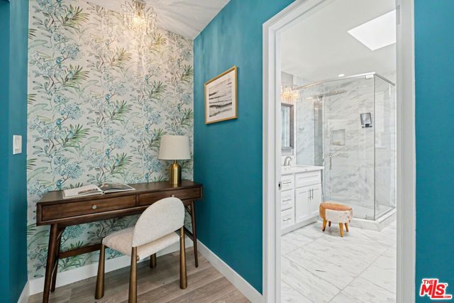 Tucked away South of the Boulevard on a quiet, tree-lined street in Woodland Hills, this thoughtfully remodeled home offers a sense of privacy, natural light, and effortless indoor-outdoor living. The living room features a stone fireplace and French doors that open to a landscaped yard with rose bushes, fruit trees, and unobstructed hillside views. The updated kitchen includes Viking appliances, white shaker cabinetry, quartz countertops, and a large island, which flows seamlessly into the dining and family areas with direct access to multiple patio spaces; well-suited for both everyday living and entertaining. A refined material palette carries throughout the home, including stone, quartz, and marble surfaces, complemented by patterned Moroccan tile and curated wallpaper accents that add subtle contrast and design detail. Upstairs, the primary suite offers a walk-in closet, vanity area, and a bath with a skylight, dual sinks, and marble finishes. Secondary bedrooms include one with access to a resurfaced waterproof deck and another with treetop views. Additional upgrades completed approximately five years ago include the roof, gutters, electrical panel, tankless water heater, and exterior hardscape. Conveniently located near Calabasas, with proximity to shopping and dining, including Bristol Farms and the Calabasas Commons.
