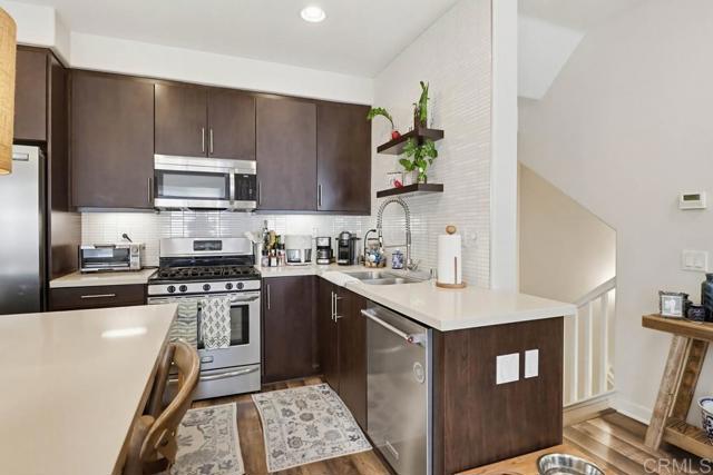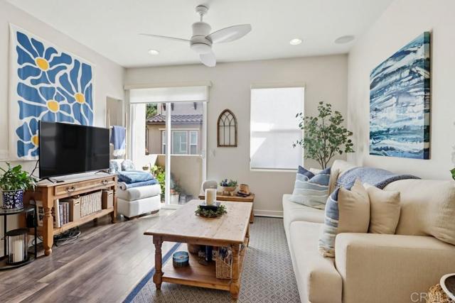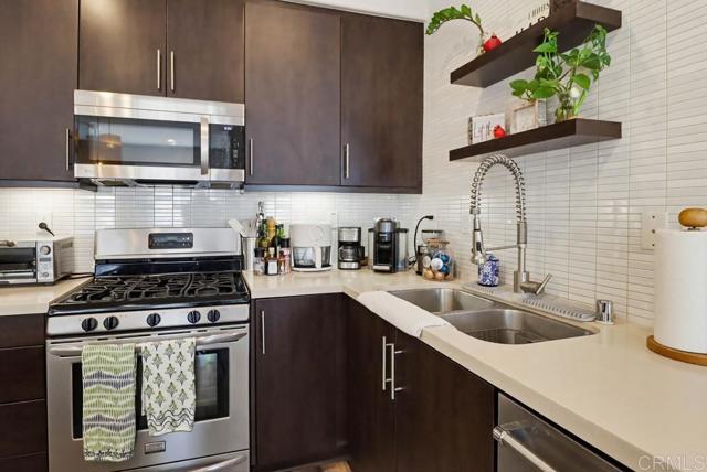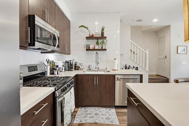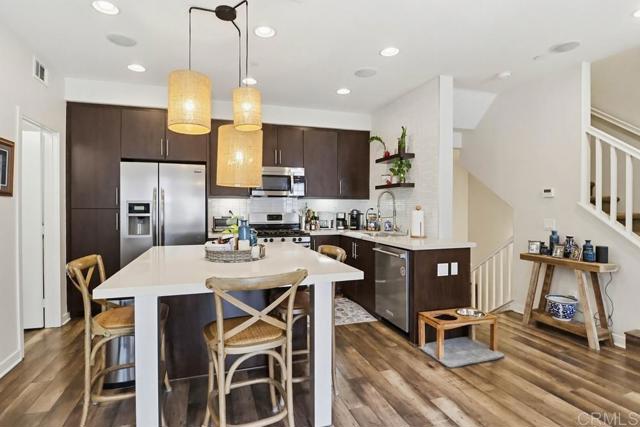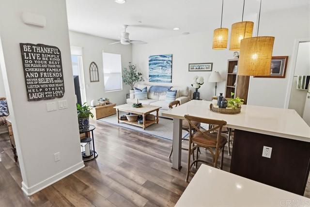 Nicely upgraded 2 bedroom condo in Solaire complex. Professional window coverings with black out shades in both bedrooms. Built in wire ceiling racks for overhead storage in 2 car garage plus extra storage area. Recessed lighting throughout the house with dimmers. Stacked washer /dryer in unit Ceiling fans in both bedrooms and family room. The gourmet kitchen offers a center island, granite countertops and stainless steel appliances. Tiled backsplash above kitchen sink with decorative shelves. Luxury vinyl wood-look flooring throughout living areas. Community amenities include a swimming pool, spa, and an outdoor barbecue area. Current tenant will be vacating late June. Unit will be available July 1st.
