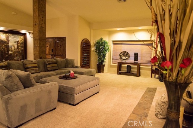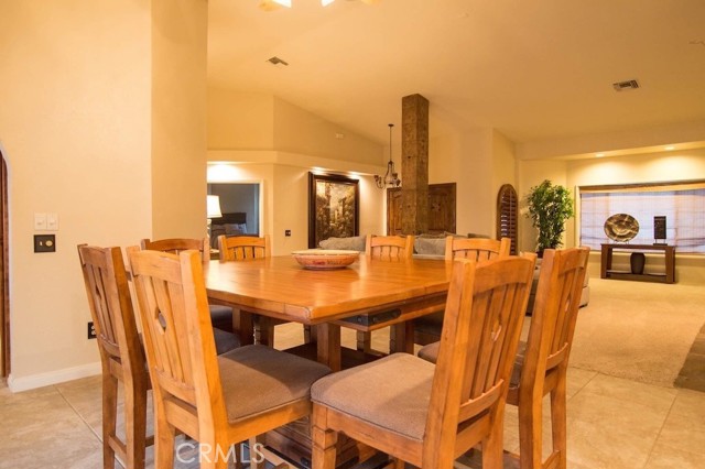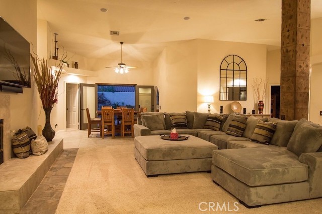 Step through the grand entrance into an expansive open-concept living area featuring soaring vaulted ceilings, a cozy fireplace, and a large flat-screen TV — perfect for relaxing after a day in the desert sun. The generous living space flows seamlessly into the dining area, making this home ideal for both entertaining and everyday living.