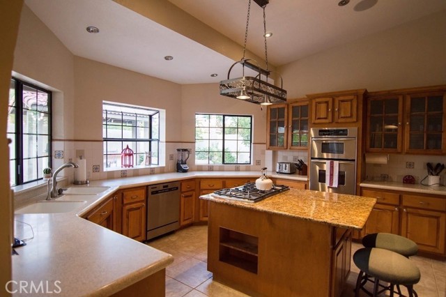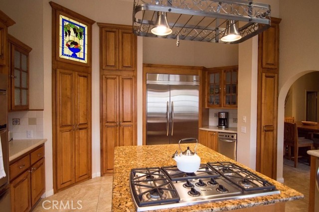 The gourmet kitchen is a chef's dream, boasting rich custom wood cabinetry, stunning granite countertops, a 5-burner gas cooktop island, stainless steel appliances including a built-in refrigerator, and a charming stained glass accent window that adds a one-of-a-kind artistic touch.