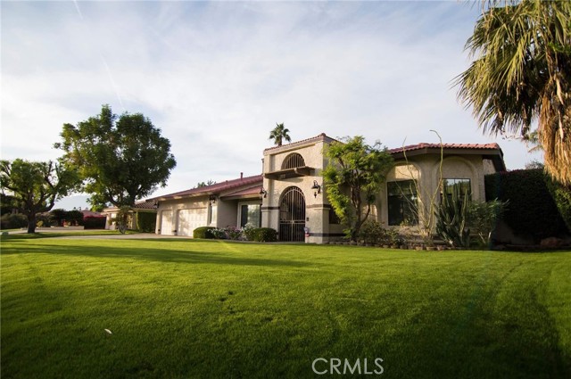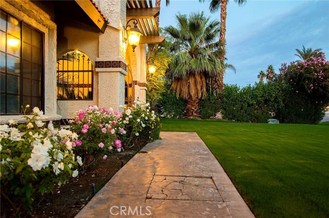 Welcome to this breathtaking Mediterranean-style home nestled in the exclusive gated community of Bermuda Dunes Country Club. From the moment you arrive, the dramatic arched entryway, warm exterior lighting, and lush manicured lawn set the tone for the elegance that awaits inside.