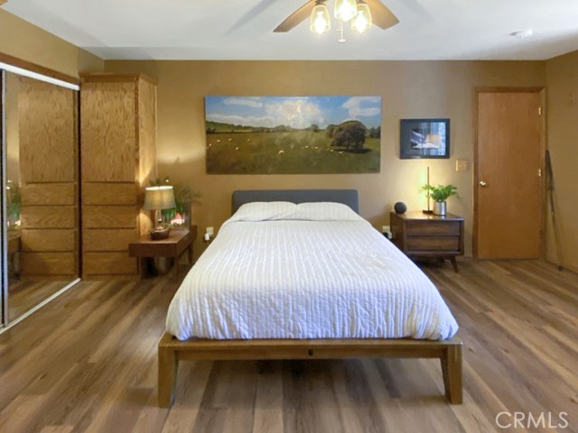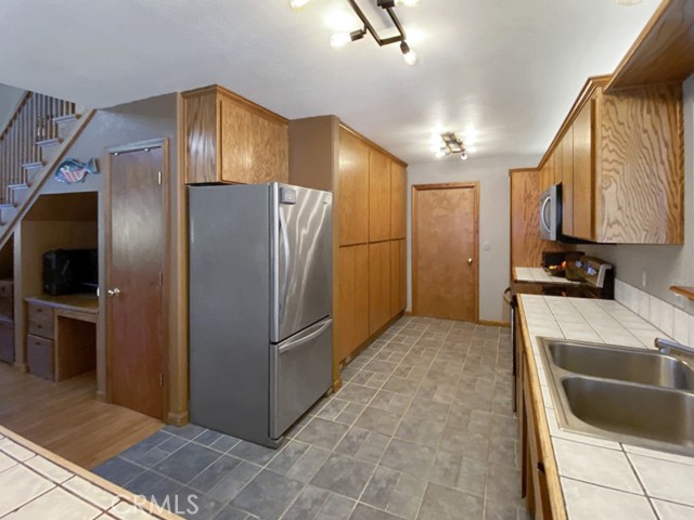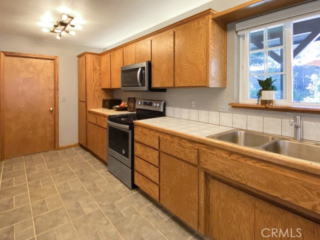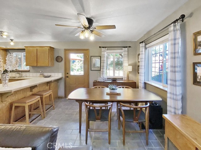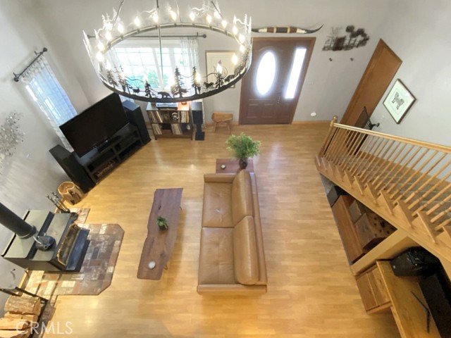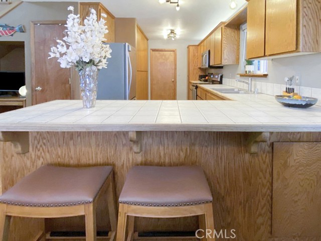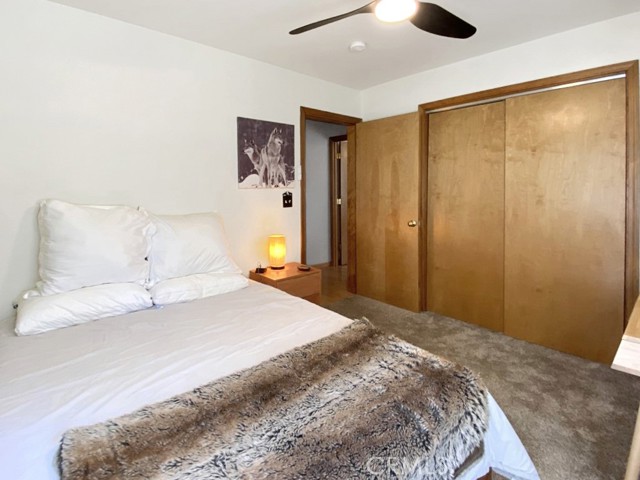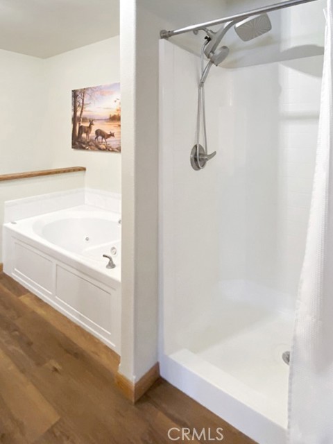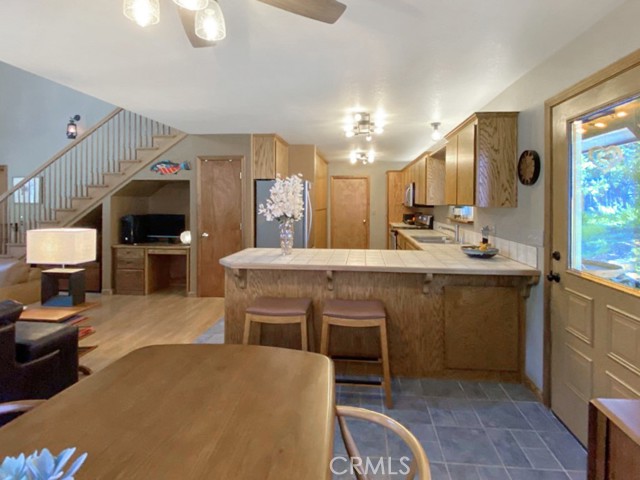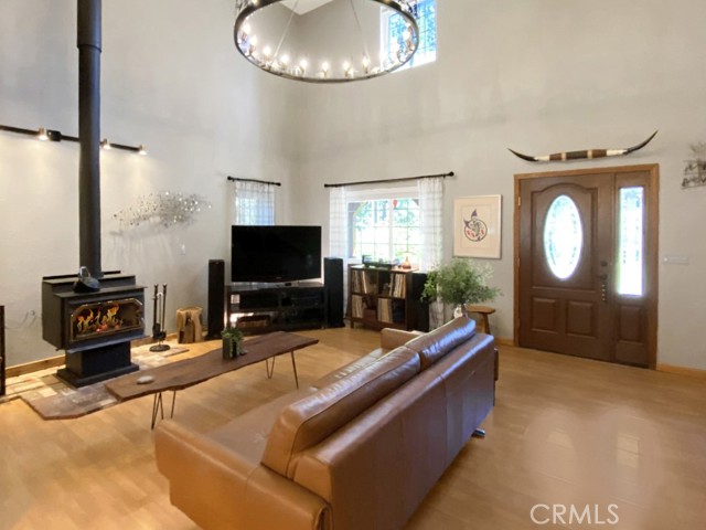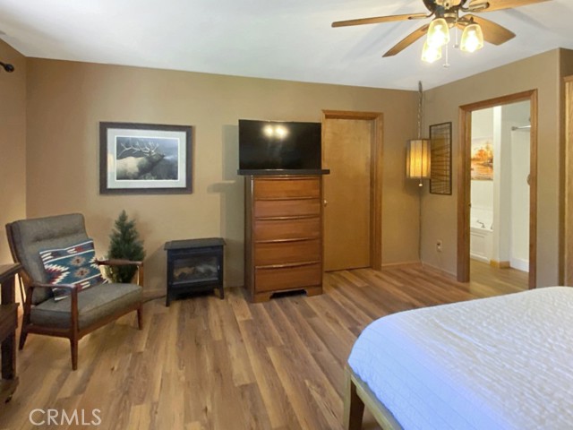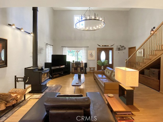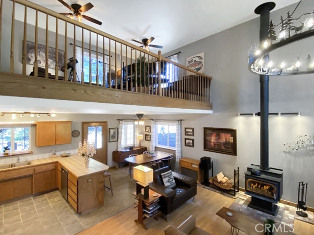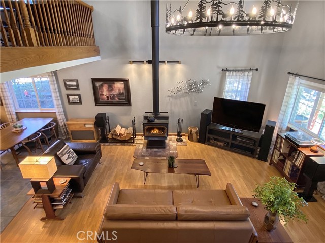 Inside, the home welcomes you with soaring vaulted ceilings in the great room, anchored by a cozy wood stove. The open layout flows into a dining area and a kitchen with ample storage and a breakfast bar for casual dining. The expansive downstairs master suite offers a private retreat, complete with a walk-in closet, built-in cabinetry, a jetted tub, and a separate walk-in shower.
