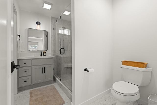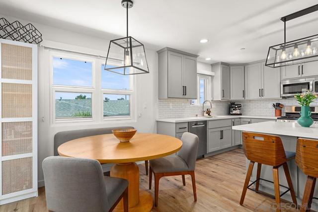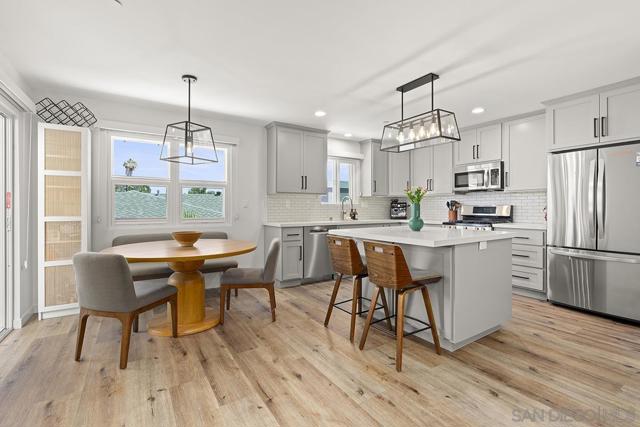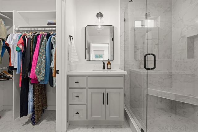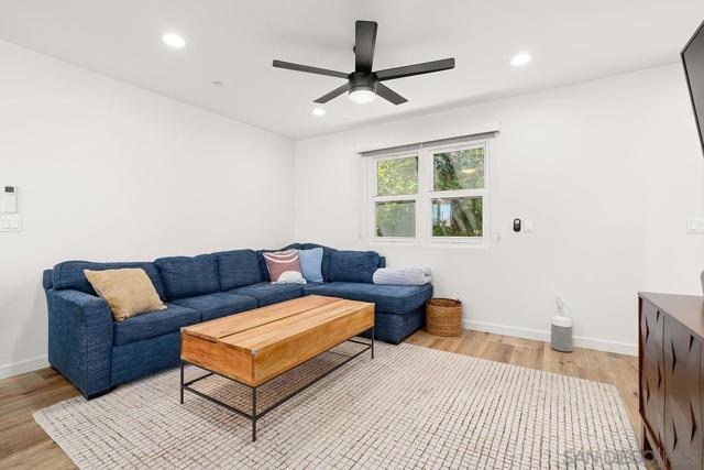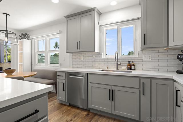 Ideally situated at the vibrant crossroads of South Park and Golden Hill, this striking townhome offers a rare blend of style, privacy, and location. One of only three residences in an exclusive gated enclave built in 2019, each home is fully detached—cleverly designed with faux connectors for aesthetic continuity—meaning no shared walls. The thoughtfully designed layout begins on the entry level, featuring an attached two-car garage, two spacious bedrooms, and a full bath—perfect for children, guests, or a home office. Upstairs, the light-filled main level showcases an open-concept design that connects the living, dining, and kitchen areas to an expansive patio, ideal for indoor-outdoor entertaining. This level also includes a powder room, laundry room, and a serene primary suite with direct patio access. At the top, a private rooftop deck delivers panoramic views from San Diego Bay to Mexico and beyond—creating an unforgettable setting for relaxing or entertaining. Enjoy unbeatable access to some of San Diego’s best dining, shopping, and nightlife, along with close proximity to Balboa Park, Petco Park, downtown, major freeways, and the airport. This is a rare opportunity to own a truly unique home in one of San Diego’s most sought-after neighborhoods. Additional highlights include a quiet, insulated garage door with LiftMaster system, an outdoor space/dog run behind the garage, Milgard Quiet Line double dual-pane windows, and modern efficiency upgrades like a tankless water heater and EV/solar readiness. The chef’s kitchen features a large quartz island, abundant soft-close cabinetry, and stainless LG appliances. A spacious primary bedroom walk-in closet, automatic gated alley access, and low $215/month HOA fees complete the package. No size restrictions on dogs.