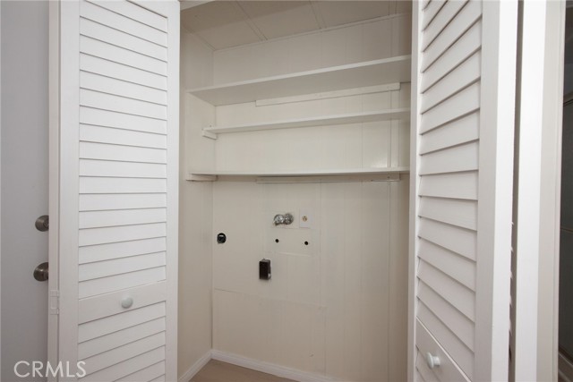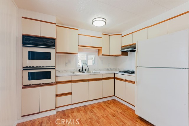 The kitchen features a built-in double oven, gas cooktop with hood over range, and ample cabinetry. An indoor laundry area with hookups adds everyday convenience. The home includes 2 bedrooms and 1 bathroom with a walk-in shower. The primary bedroom offers a spacious walk-in closet.