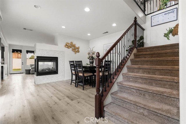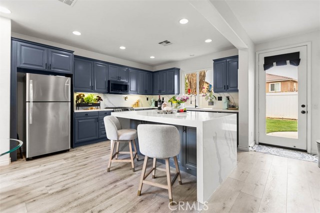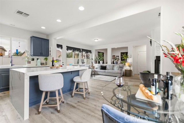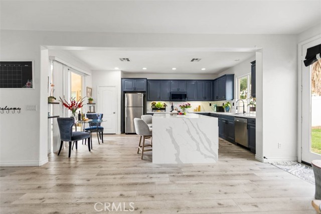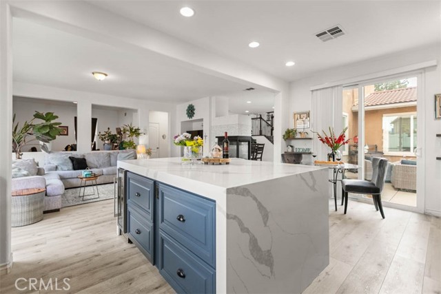 Inside, the home opens with a sense of light and order. Sunlight filters through French doors and wide windows, casting a warm glow across an open-concept layout designed for both daily routines and spontaneous gatherings. The kitchen, thoughtfully updated, anchors the space with a large center island and clean, modern finishes. It is where life happens. Meals are shared, conversations linger, and time slows just enough to notice.